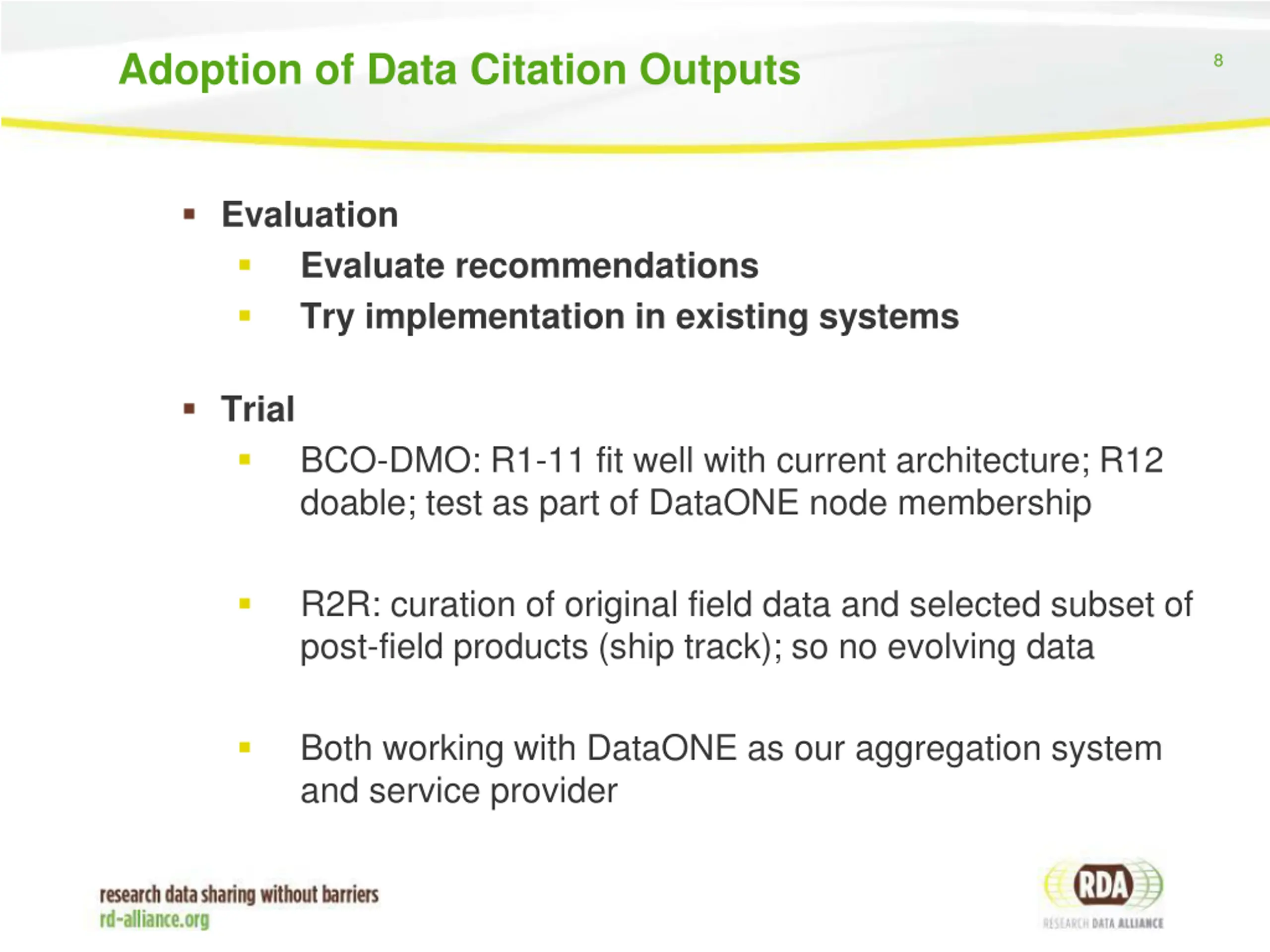 Adoption of Data Citation Outputs 8 Evaluation Evaluate recommendations Try implementation in existing systems Trial BCO-DMO: R1-11 fit well with current architecture; R12 doable; test as part of DataONE node membership R2R: curation of original field data and selected subset of post-field products (ship track); so no evolving data Both working with DataONE as our aggregation system and service provider
