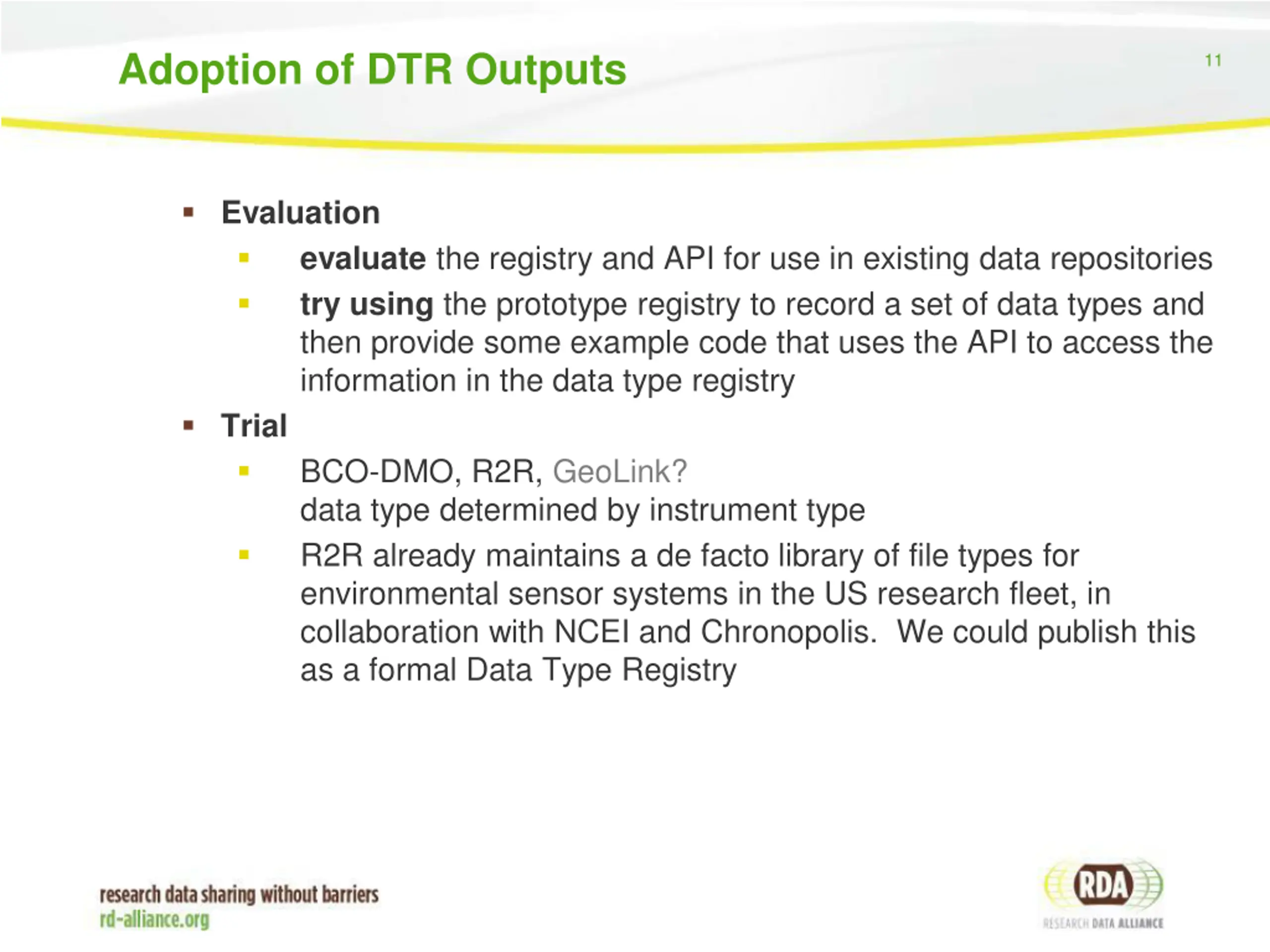 Adoption of DTR Outputs 11 Evaluation evaluate the registry and API for use in existing data repositories try using the prototype registry to record a set of data types and then provide some example code that uses the API to access the information in the data type registry Trial BCO-DMO, R2R, GeoLink? data type determined by instrument type R2R already maintains a de facto library of file types for environmental sensor systems in the US research fleet, in collaboration with NCEI and Chronopolis. We could publish this as a formal Data Type Registry