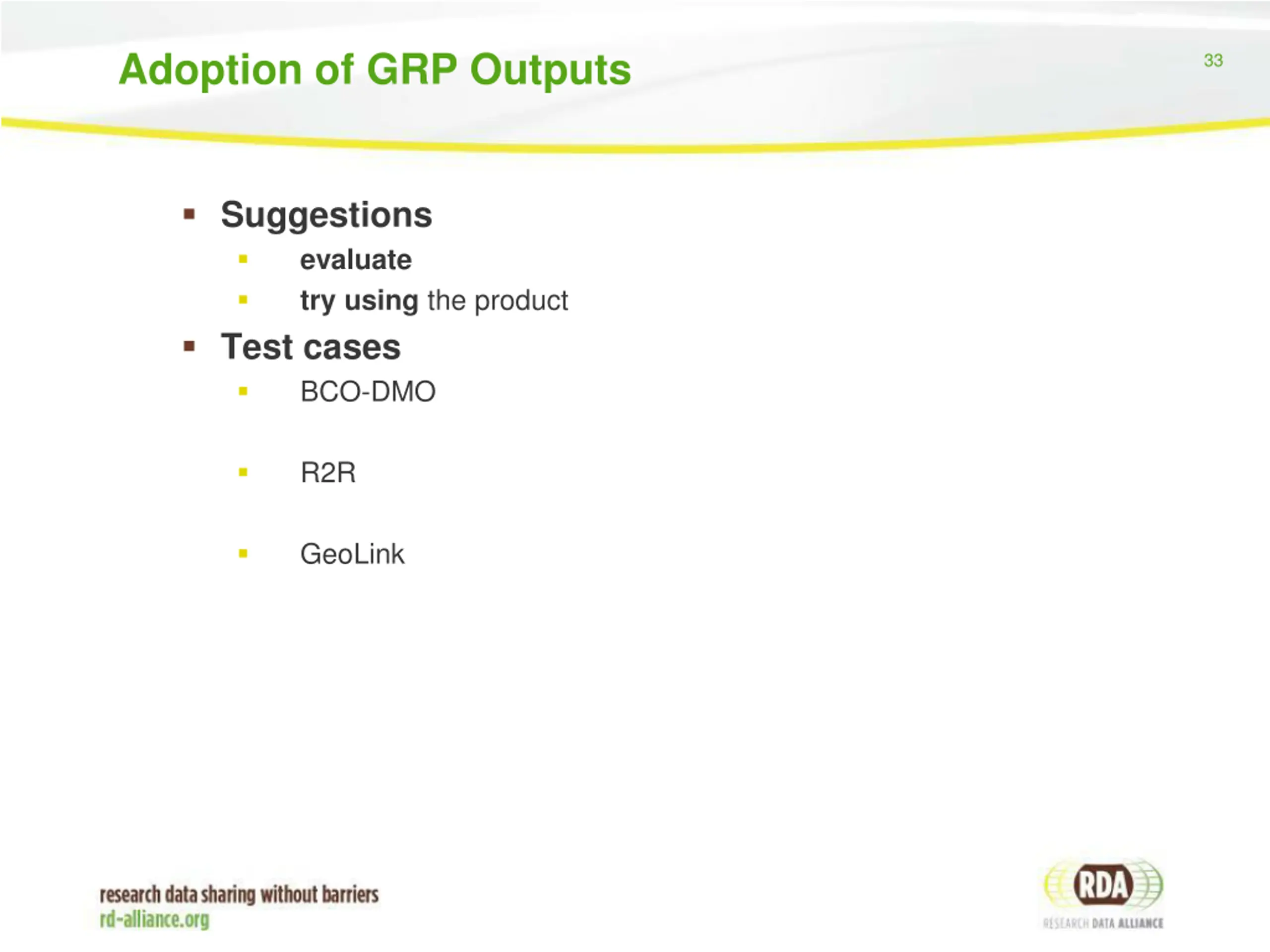 Adoption of GRP Outputs 33 Suggestions evaluate try using the product Test cases BCO-DMO R2R GeoLink