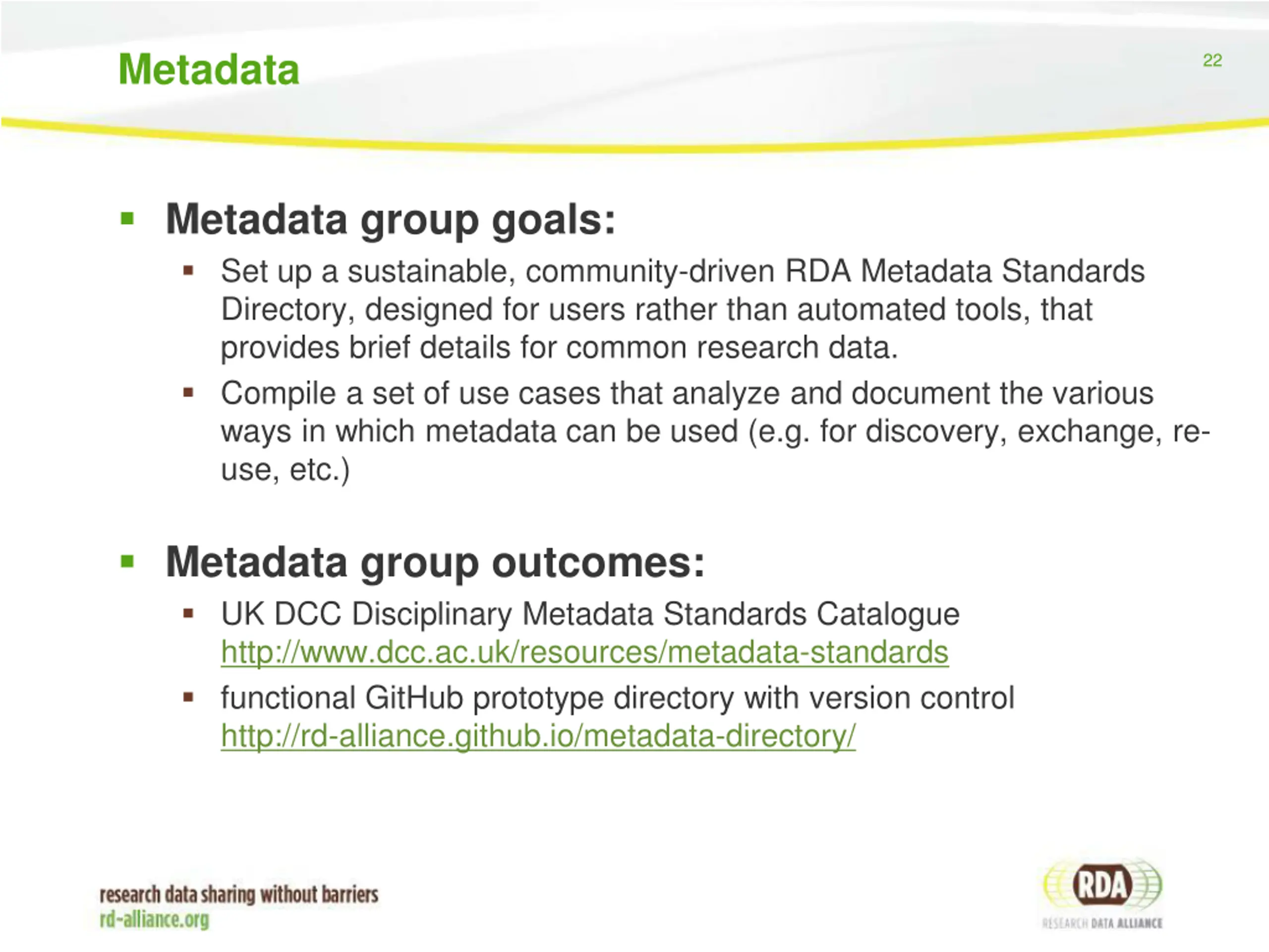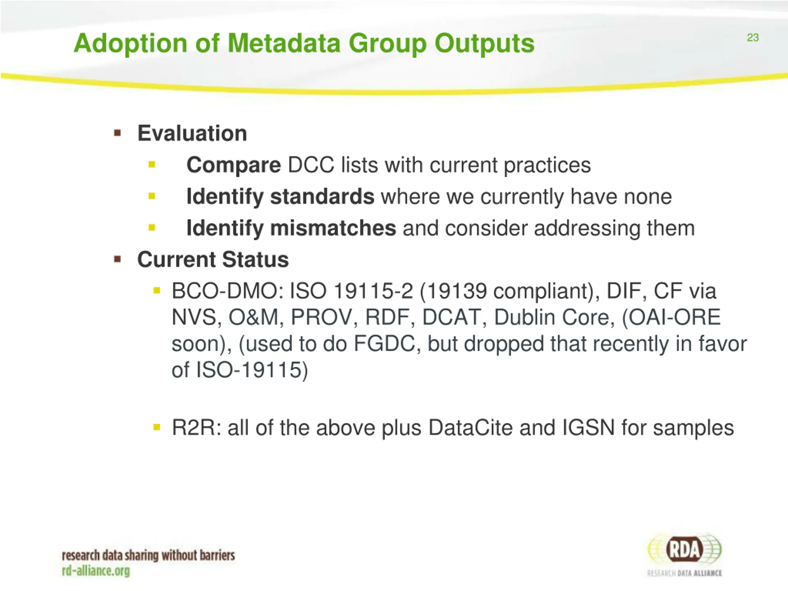 Metadata 22 Metadata group goals: Set up a sustainable, community-driven RDA Metadata Standards Directory, designed for users rather than automated tools, that provides brief details for common research data. Compile a set of use cases that analyze and document the various ways in which metadata can be used (e.g. for discovery, exchange, re- use, etc.) Metadata group outcomes: UK DCC Disciplinary Metadata Standards Catalogue http://www.dcc.ac.uk/resources/metadata-standards functional GitHub prototype directory with version control http://rd-alliance.github.io/metadata-directory/