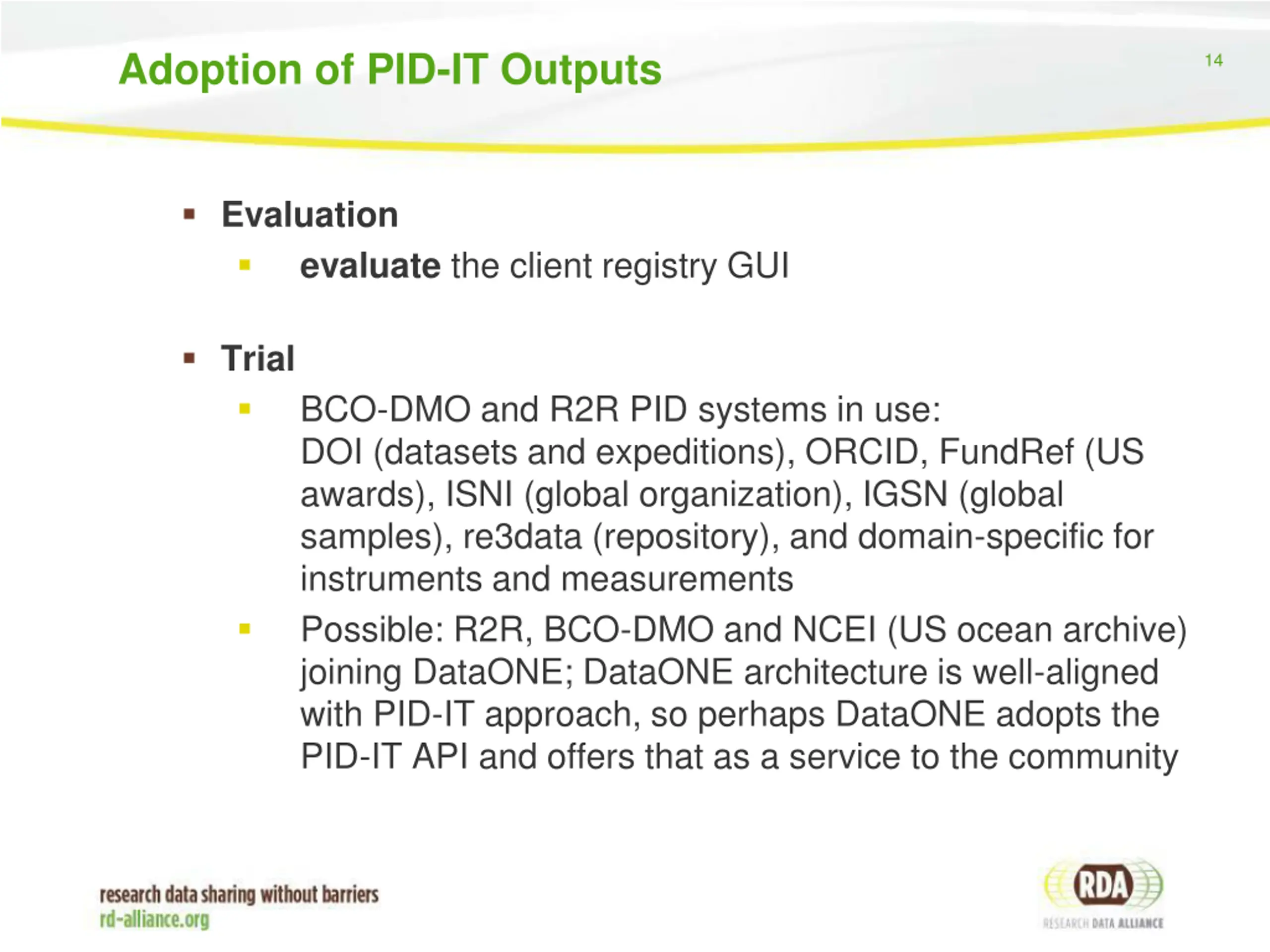 Adoption of PID-IT Outputs 14 Evaluation evaluate the client registry GUI Trial BCO-DMO and R2R PID systems in use: DOI (datasets and expeditions), ORCID, FundRef (US awards), ISNI (global organization), IGSN (global samples), re3data (repository), and domain-specific for instruments and measurements Possible: R2R, BCO-DMO and NCEI (US ocean archive) joining DataONE; DataONE architecture is well-aligned with PID-IT approach, so perhaps DataONE adopts the PID-IT API and offers that as a service to the community