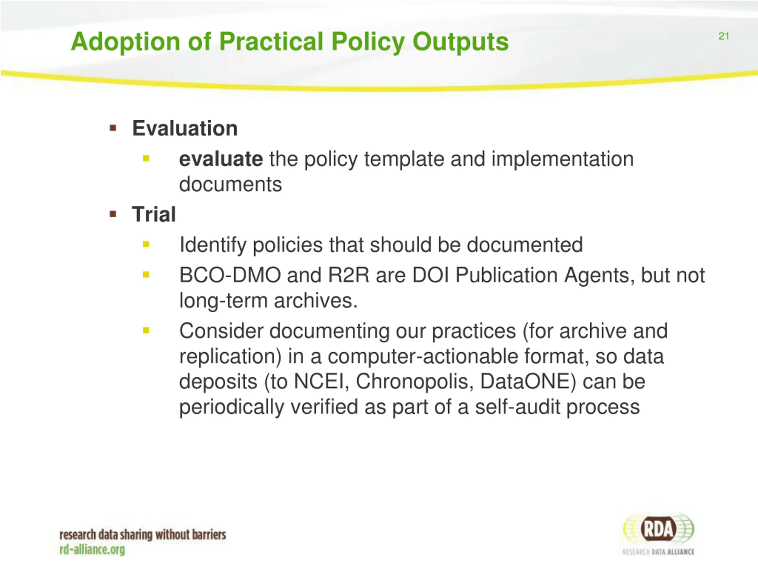 Adoption of Practical Policy Outputs 21 Evaluation evaluate the policy template and implementation documents Trial Identify policies that should be documented BCO-DMO and R2R are DOI Publication Agents, but not long-term archives. Consider documenting our practices (for archive and replication) in a computer-actionable format, so data deposits (to NCEI, Chronopolis, DataONE) can be periodically verified as part of a self-audit process