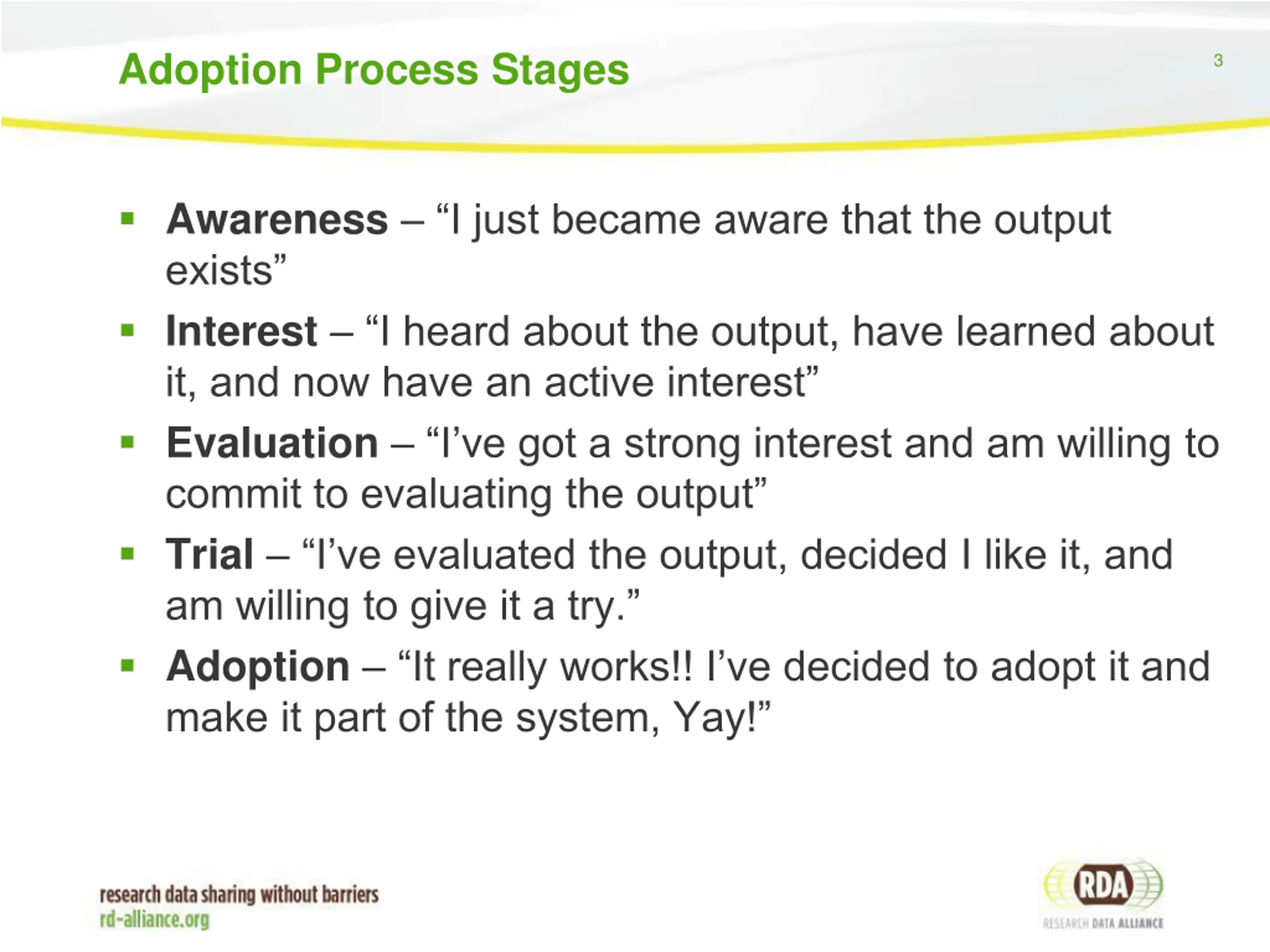 Adoption Process Stages 3 Awareness I just became aware that the output exists Interest I heard about the output, have learned about it, and now have an active interest Evaluation I ve got a strong interest and am willing to commit to evaluating the output Trial I ve evaluated the output, decided I like it, and am willing to give it a try. Adoption It really works!! I ve decided to adopt it and make it part of the system, Yay!