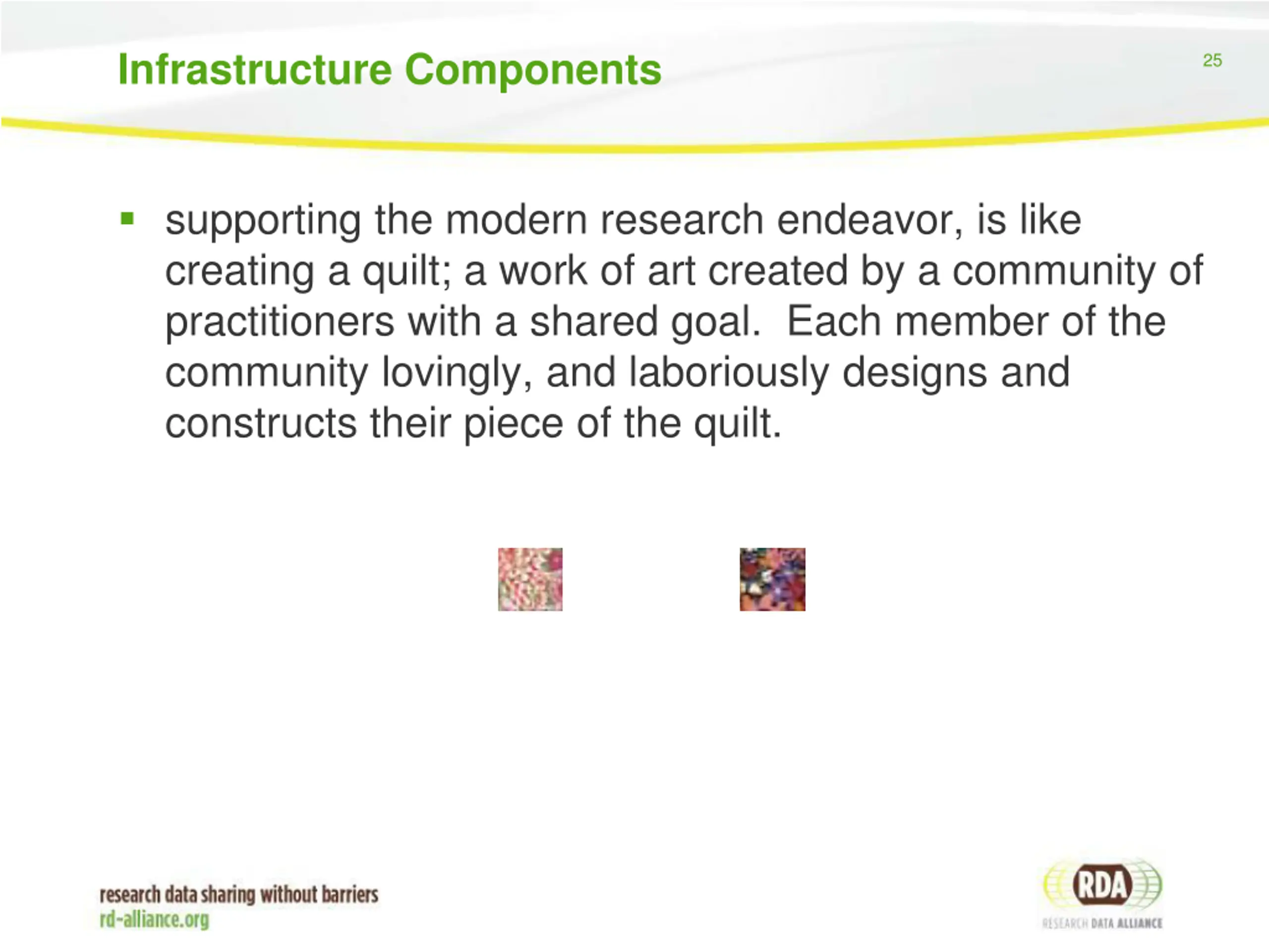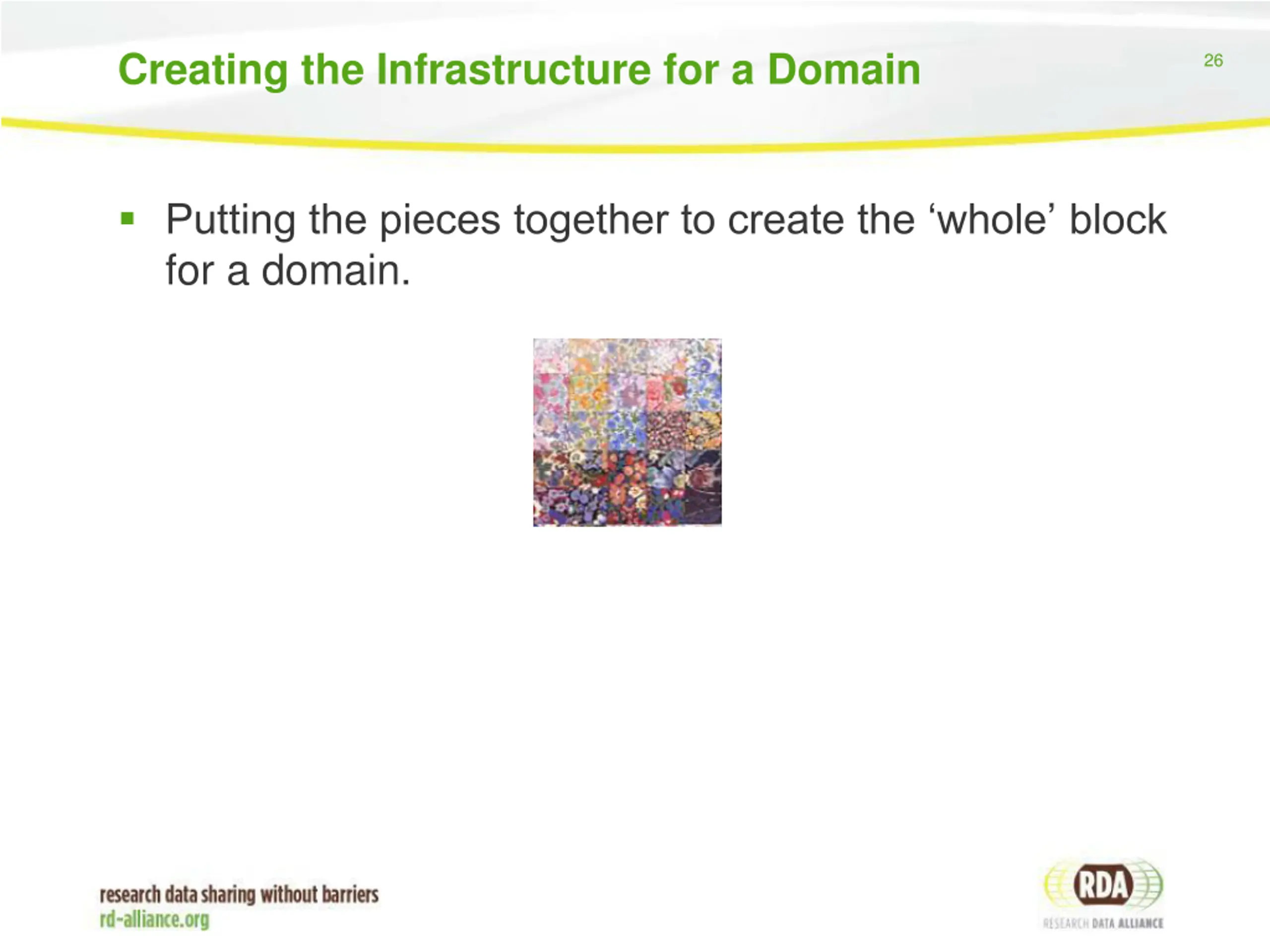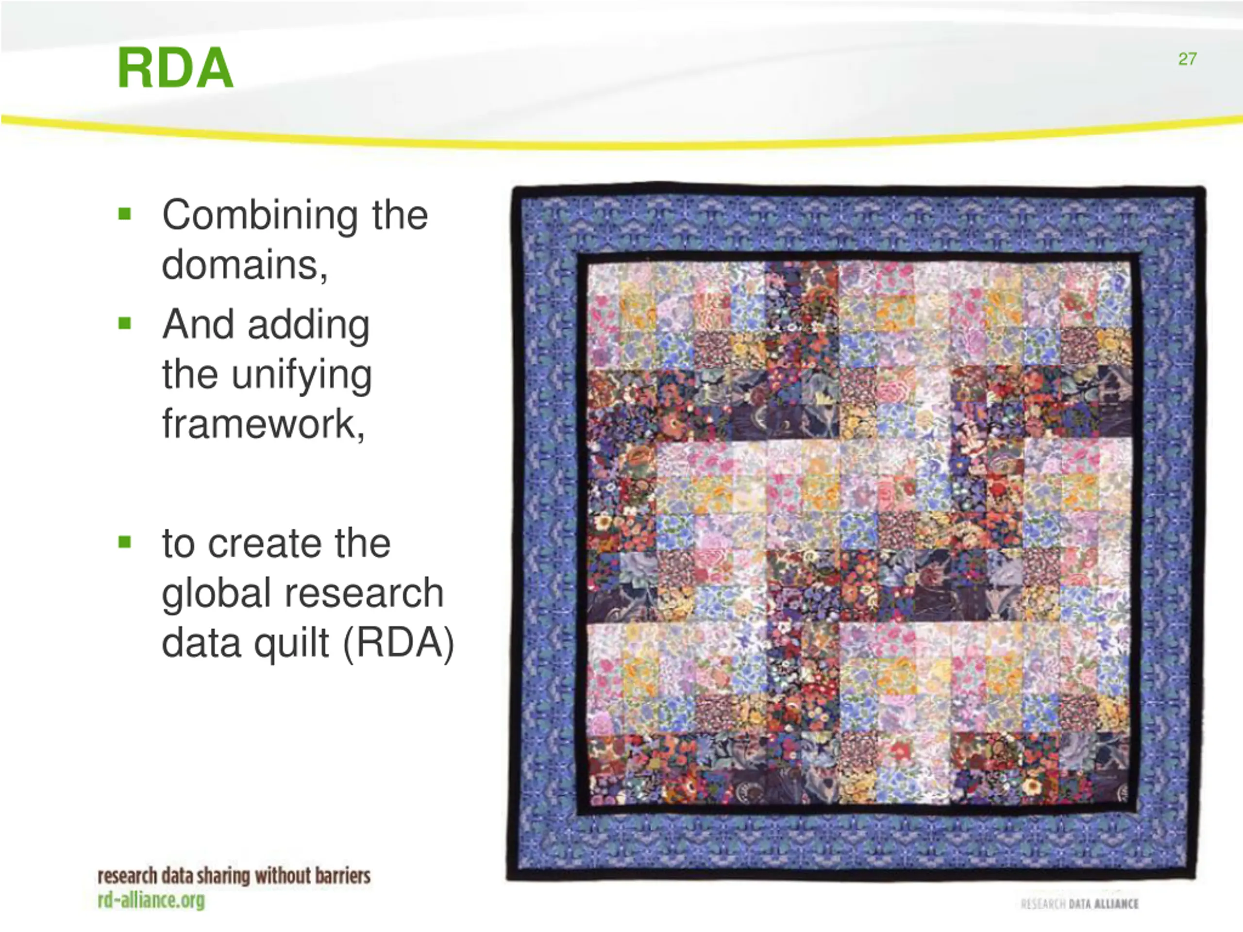 RDA 27 Combining the domains, And adding the unifying framework, to create the global research data quilt (RDA)