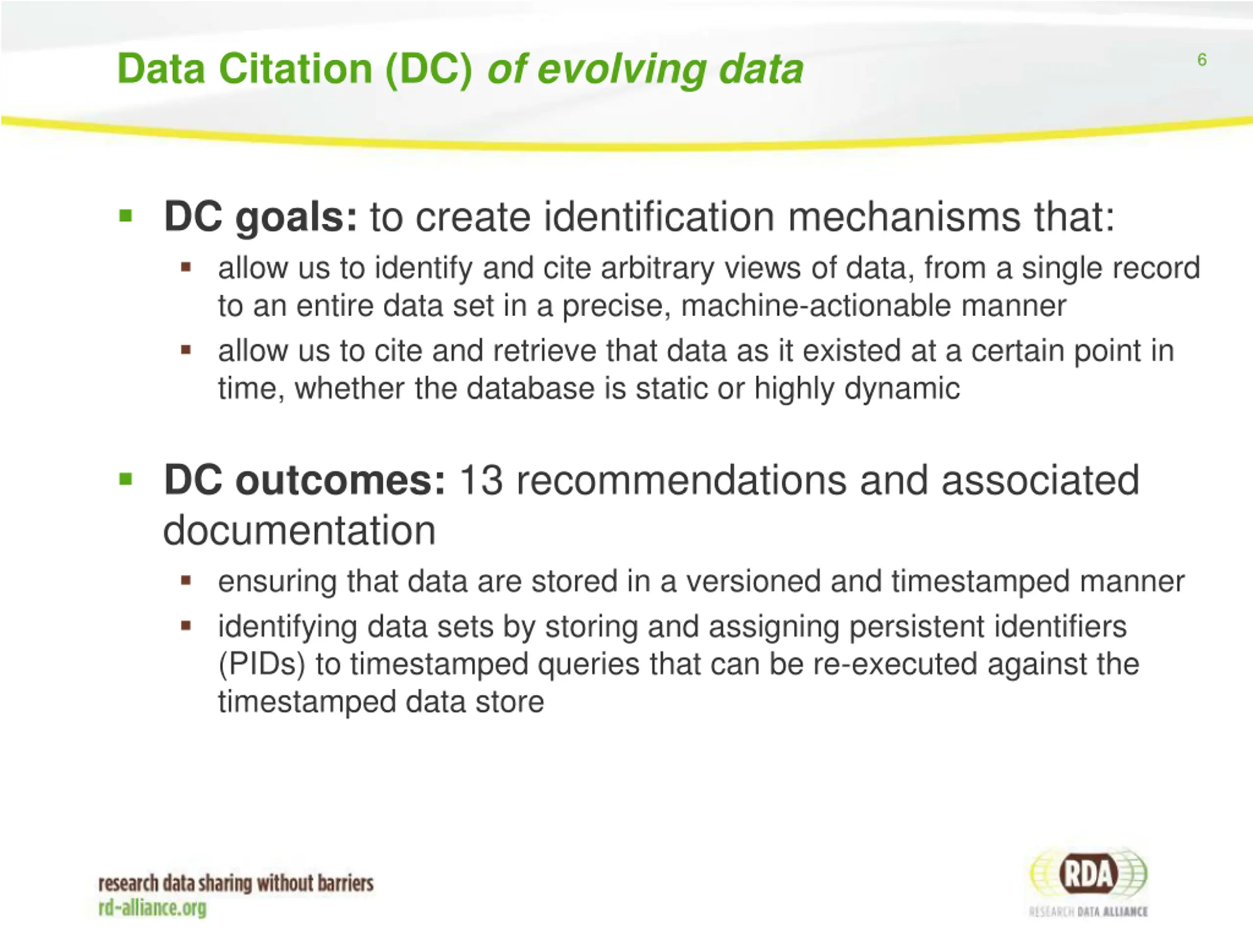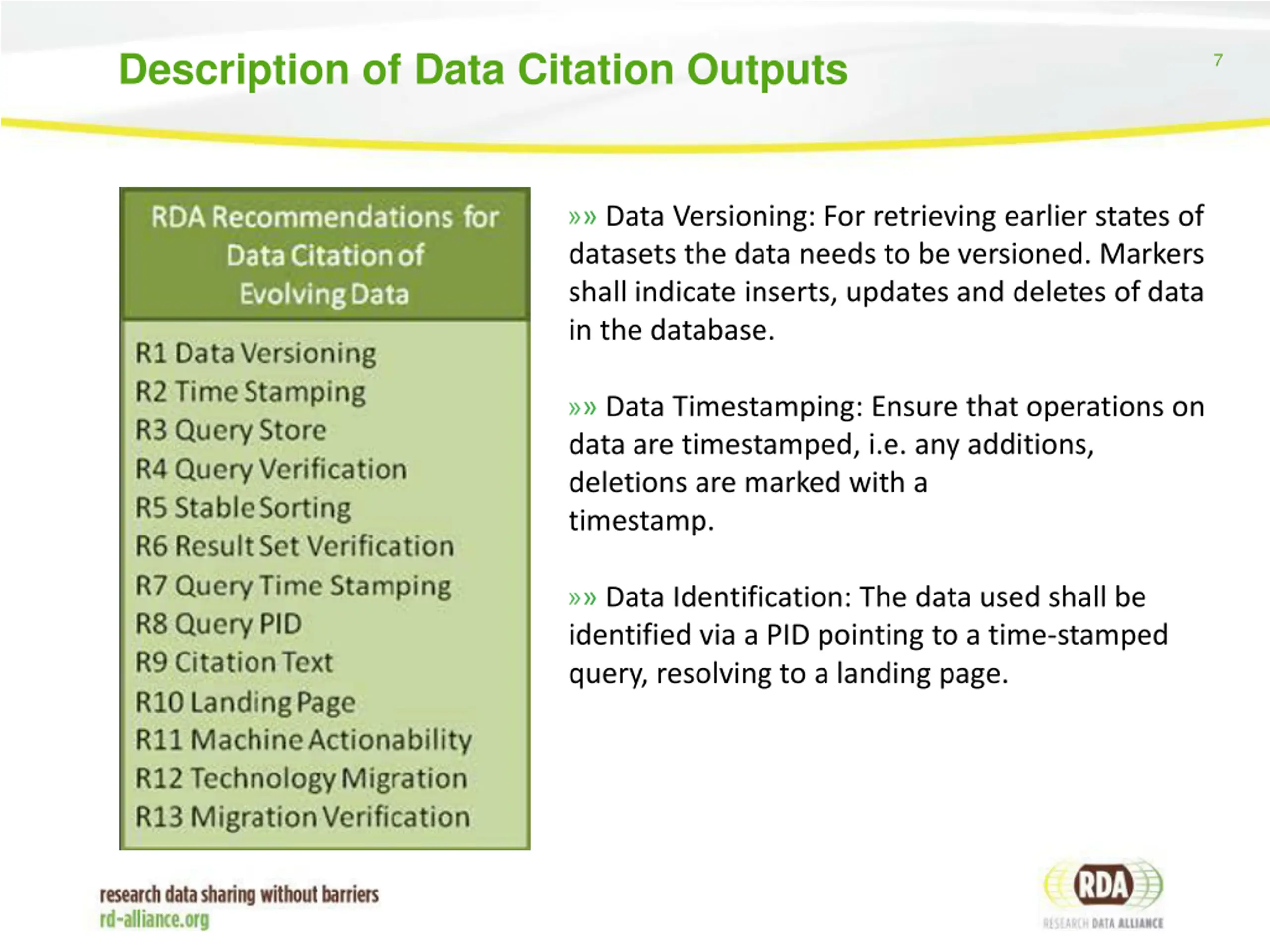 Data Citation (DC) of evolving data 6 DC goals: to create identification mechanisms that: allow us to identify and cite arbitrary views of data, from a single record to an entire data set in a precise, machine-actionable manner allow us to cite and retrieve that data as it existed at a certain point in time, whether the database is static or highly dynamic DC outcomes: 13 recommendations and associated documentation ensuring that data are stored in a versioned and timestamped manner identifying data sets by storing and assigning persistent identifiers (PIDs) to timestamped queries that can be re-executed against the timestamped data store