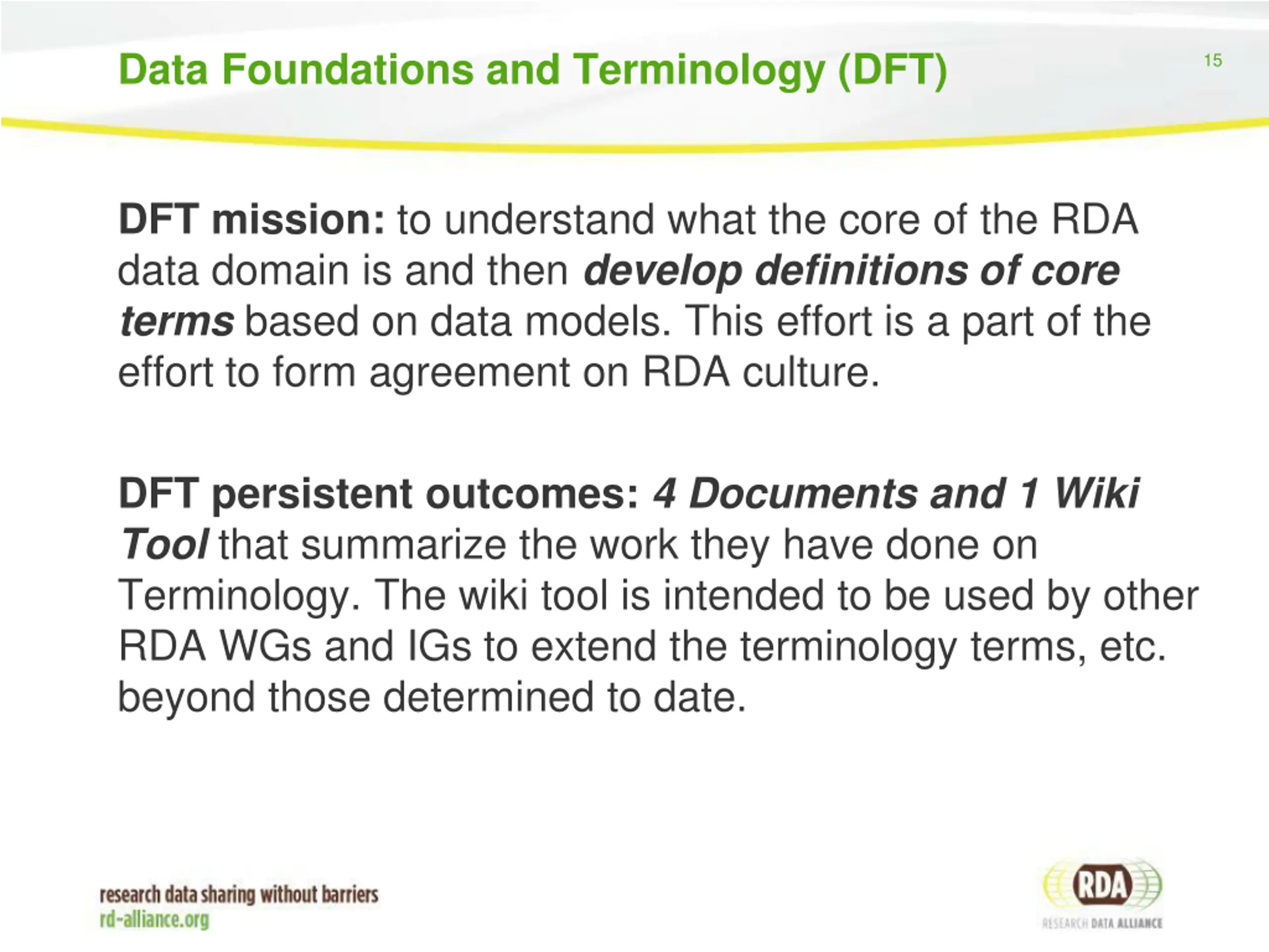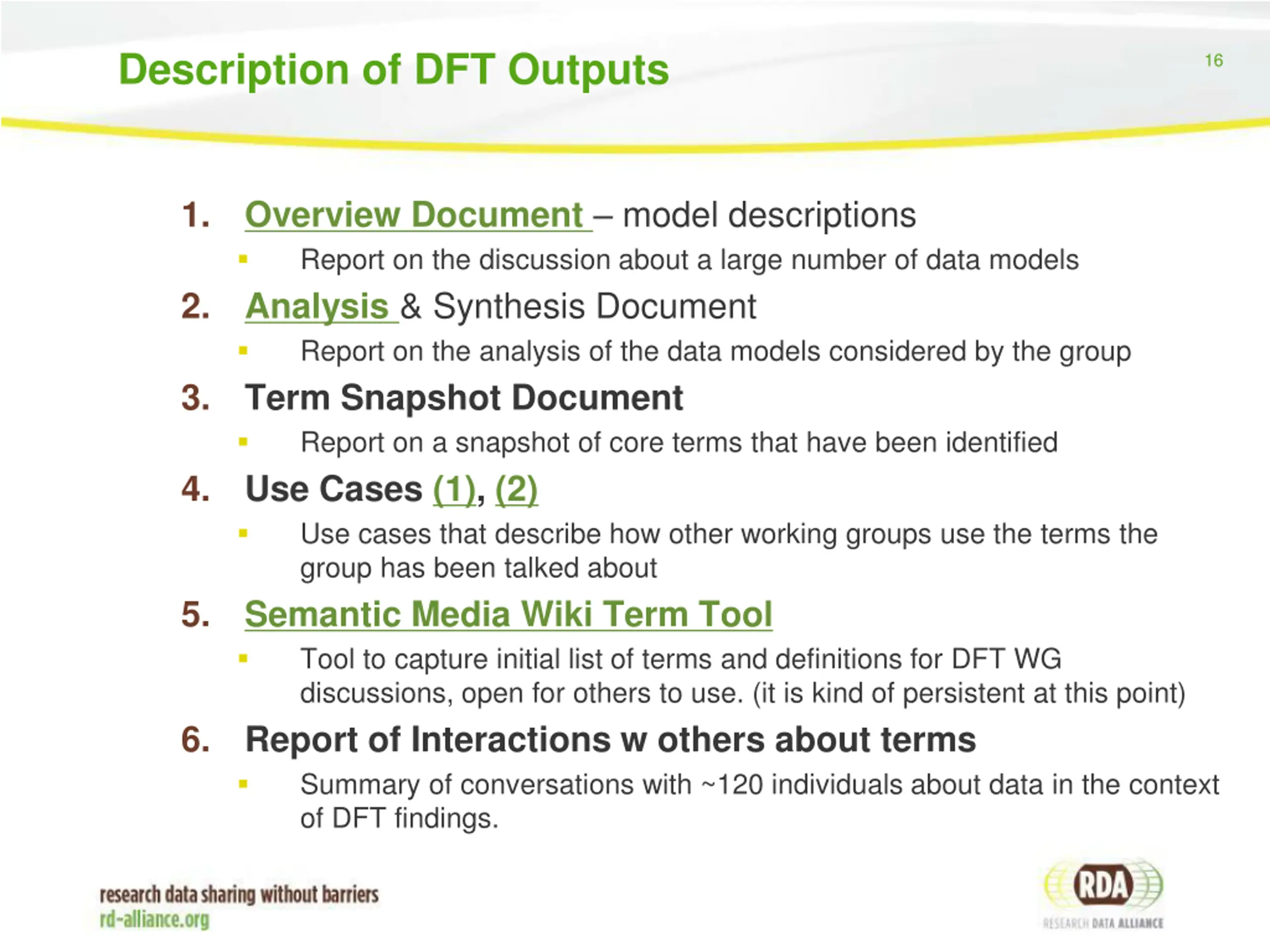 Data Foundations and Terminology (DFT) 15 DFT mission: to understand what the core of the RDA data domain is and then develop definitions of core terms based on data models. This effort is a part of the effort to form agreement on RDA culture. DFT persistent outcomes: 4 Documents and 1 Wiki Tool that summarize the work they have done on Terminology. The wiki tool is intended to be used by other RDA WGs and IGs to extend the terminology terms, etc. beyond those determined to date.