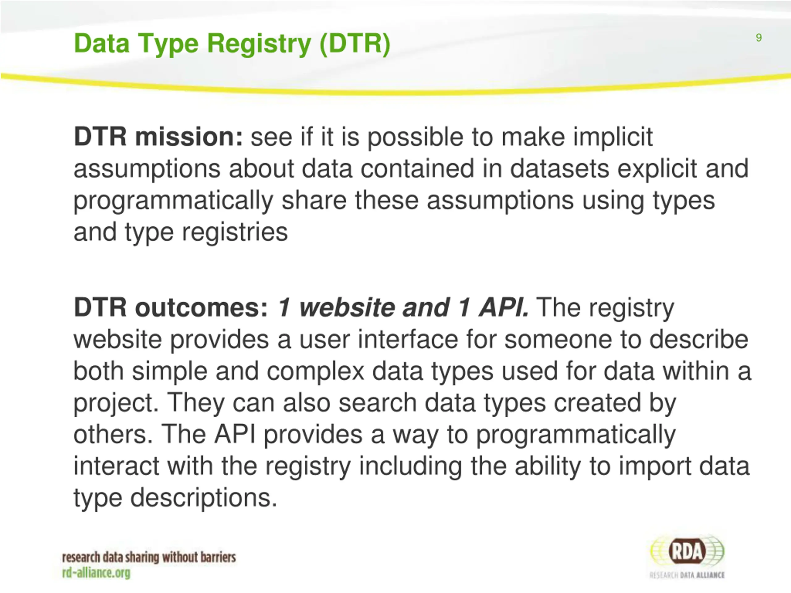Description of DTR Outputs 10 1. Data Type Registry A website with a GUI that provides a way for an authorized someone to describe a data types used in data products. 2. Data Type Registry API An API that among other things creates JSON representations of the information about data types. This is a pointer to the API specification implemented in the data type registry mentioned above.