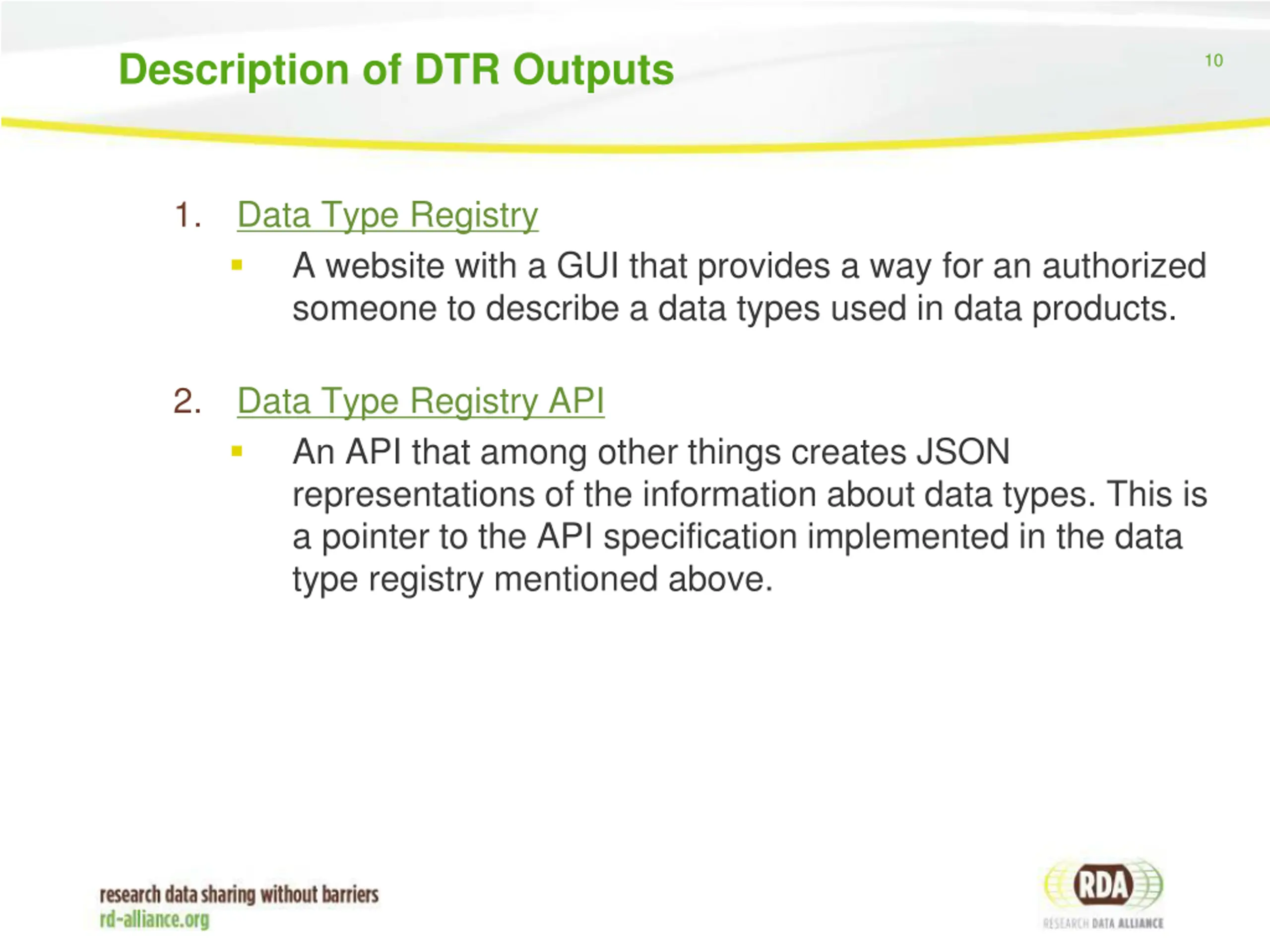 Data Type Registry (DTR) 9 DTR mission: see if it is possible to make implicit assumptions about data contained in datasets explicit and programmatically share these assumptions using types and type registries DTR outcomes: 1 website and 1 API. The registry website provides a user interface for someone to describe both simple and complex data types used for data within a project. They can also search data types created by others. The API provides a way to programmatically interact with the registry including the ability to import data type descriptions.