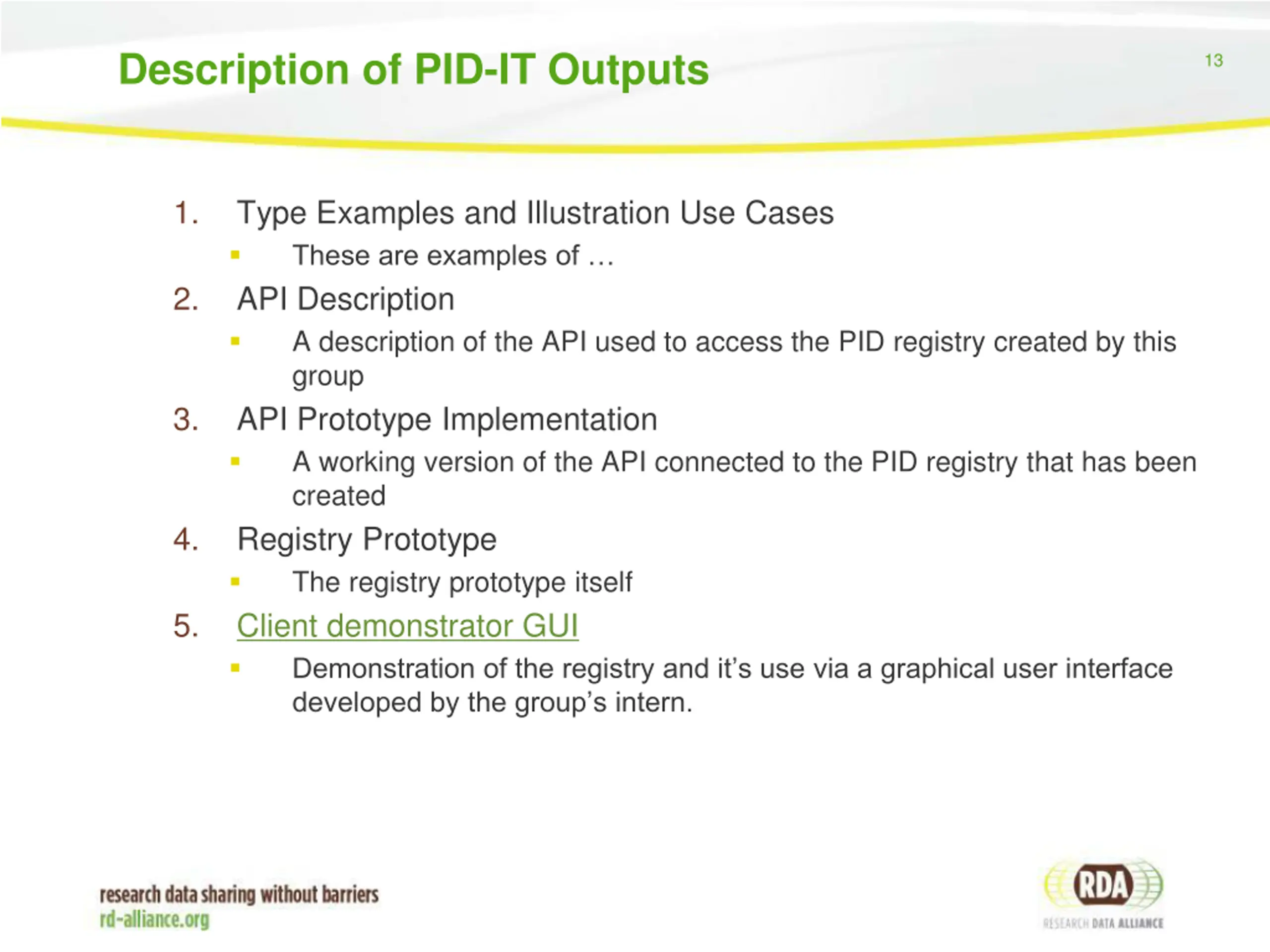 Description of PID-IT Outputs 13 1. Type Examples and Illustration Use Cases These are examples of API Description A description of the API used to access the PID registry created by this group API Prototype Implementation A working version of the API connected to the PID registry that has been created Registry Prototype The registry prototype itself Client demonstrator GUI Demonstration of the registry and it s use via a graphical user interface developed by the group s intern. 2. 3. 4. 5.