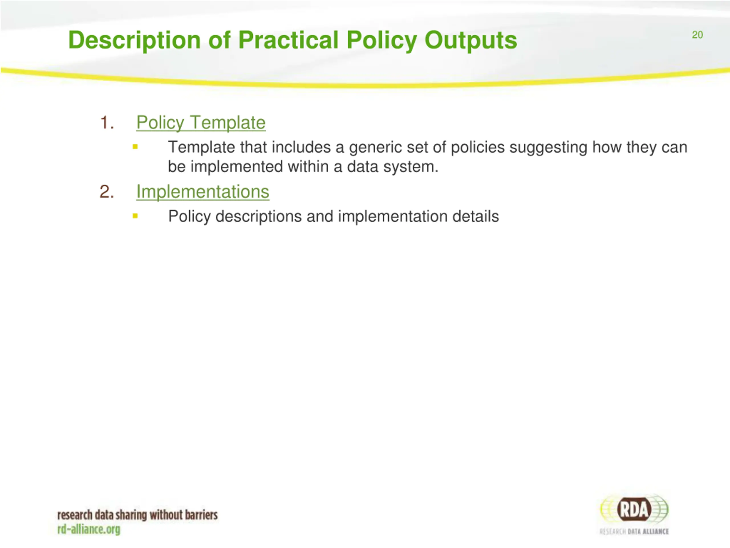 Description of Practical Policy Outputs 20 1. Policy Template Template that includes a generic set of policies suggesting how they can be implemented within a data system. Implementations Policy descriptions and implementation details 2.