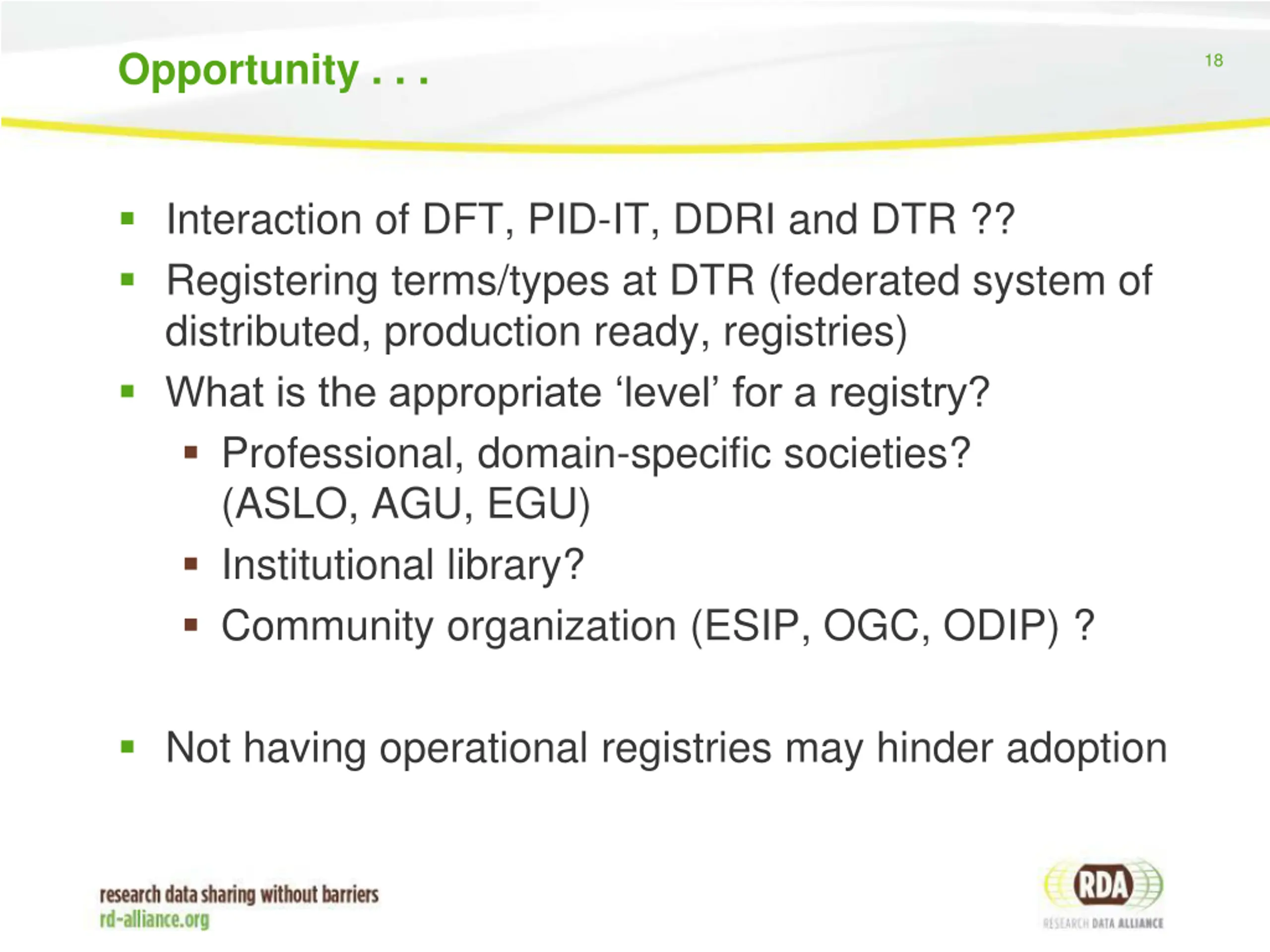 Opportunity . . . 18 Interaction of DFT, PID-IT, DDRI and DTR ?? Registering terms/types at DTR (federated system of distributed, production ready, registries) What is the appropriate level for a registry? Professional, domain-specific societies? (ASLO, AGU, EGU) Institutional library? Community organization (ESIP, OGC, ODIP) ? Not having operational registries may hinder adoption