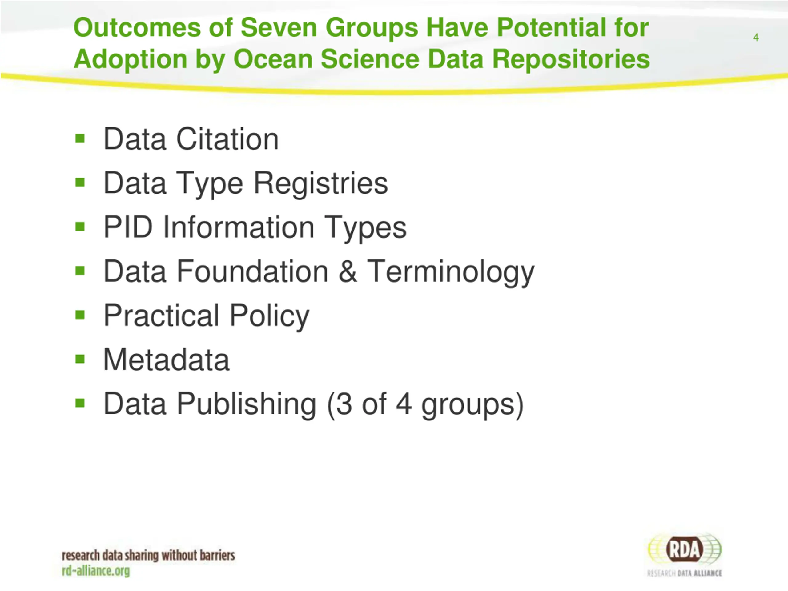 Outcomes of Seven Groups Have Potential for Adoption by Ocean Science Data Repositories 4 Data Citation Data Type Registries PID Information Types Data Foundation & Terminology Practical Policy Metadata Data Publishing (3 of 4 groups)