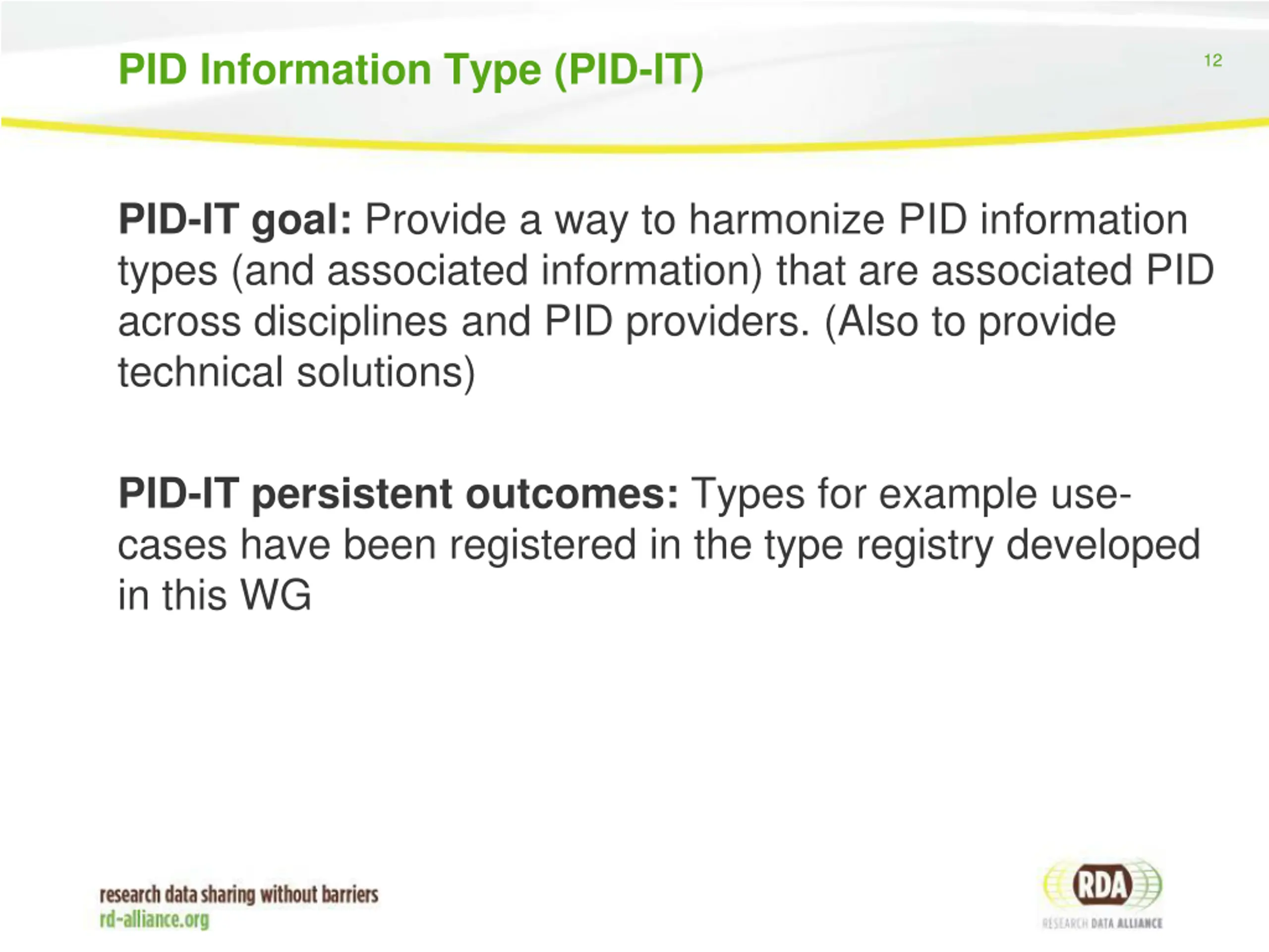 PID Information Type (PID-IT) 12 PID-IT goal: Provide a way to harmonize PID information types (and associated information) that are associated PID across disciplines and PID providers. (Also to provide technical solutions) PID-IT persistent outcomes: Types for example use- cases have been registered in the type registry developed in this WG