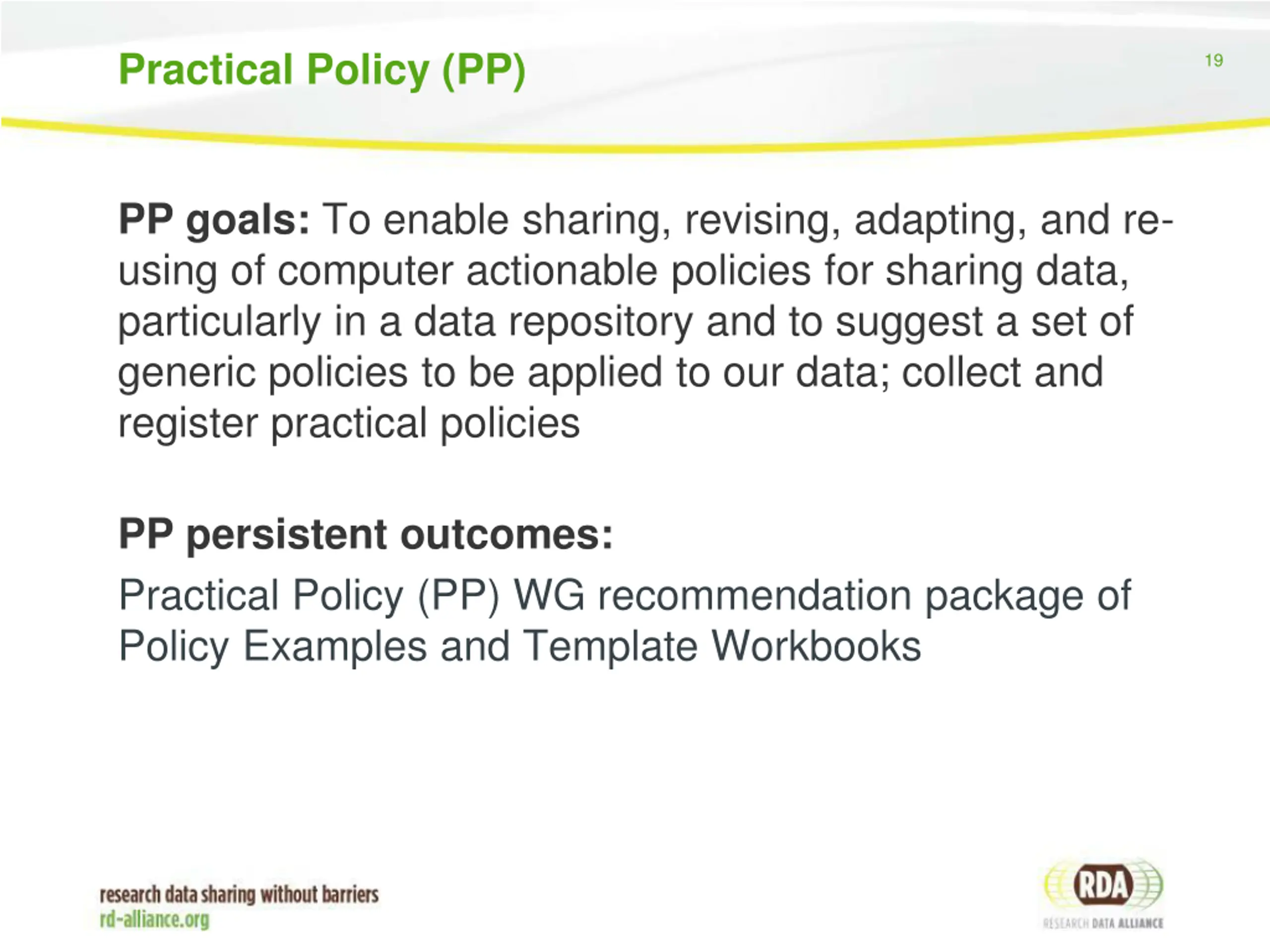 Practical Policy (PP) 19 PP goals: To enable sharing, revising, adapting, and re- using of computer actionable policies for sharing data, particularly in a data repository and to suggest a set of generic policies to be applied to our data; collect and register practical policies PP persistent outcomes: Practical Policy (PP) WG recommendation package of Policy Examples and Template Workbooks