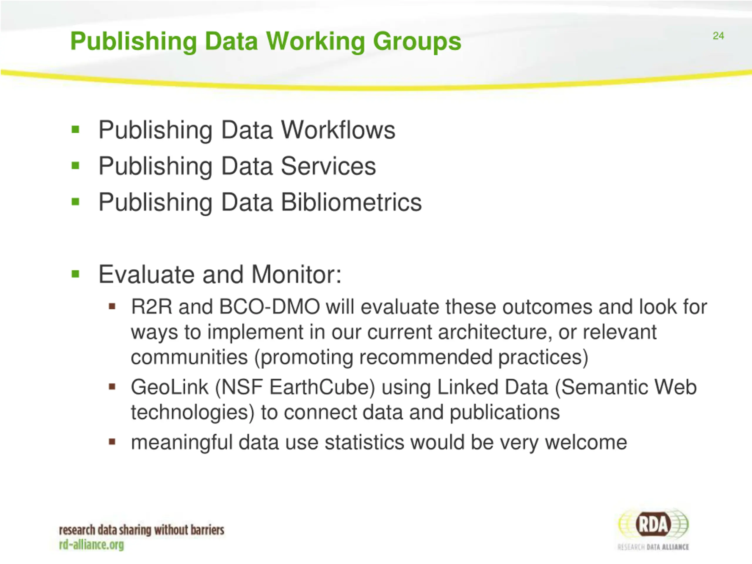 Publishing Data Working Groups 24 Publishing Data Workflows Publishing Data Services Publishing Data Bibliometrics Evaluate and Monitor: R2R and BCO-DMO will evaluate these outcomes and look for ways to implement in our current architecture, or relevant communities (promoting recommended practices) GeoLink (NSF EarthCube) using Linked Data (Semantic Web technologies) to connect data and publications meaningful data use statistics would be very welcome