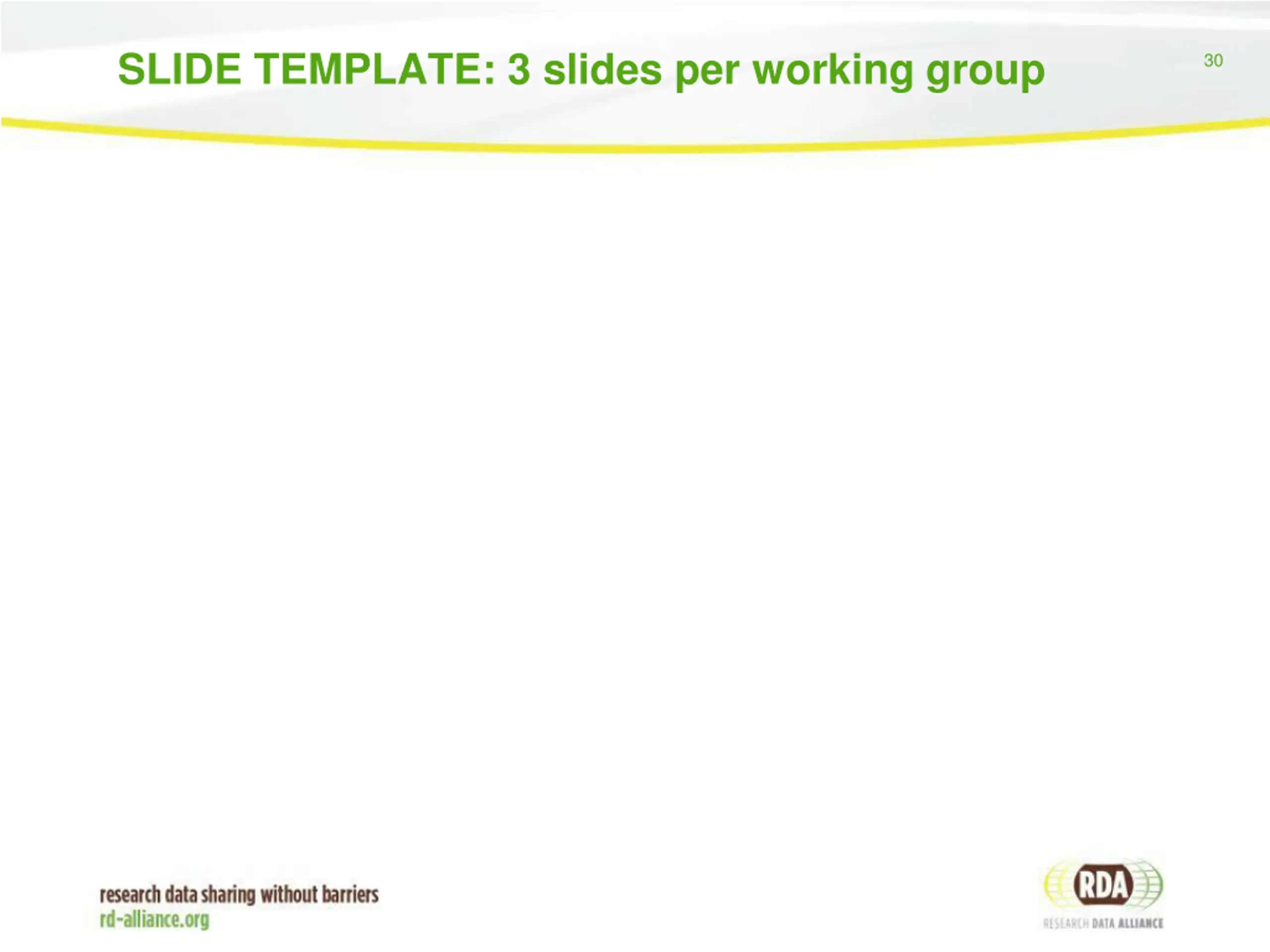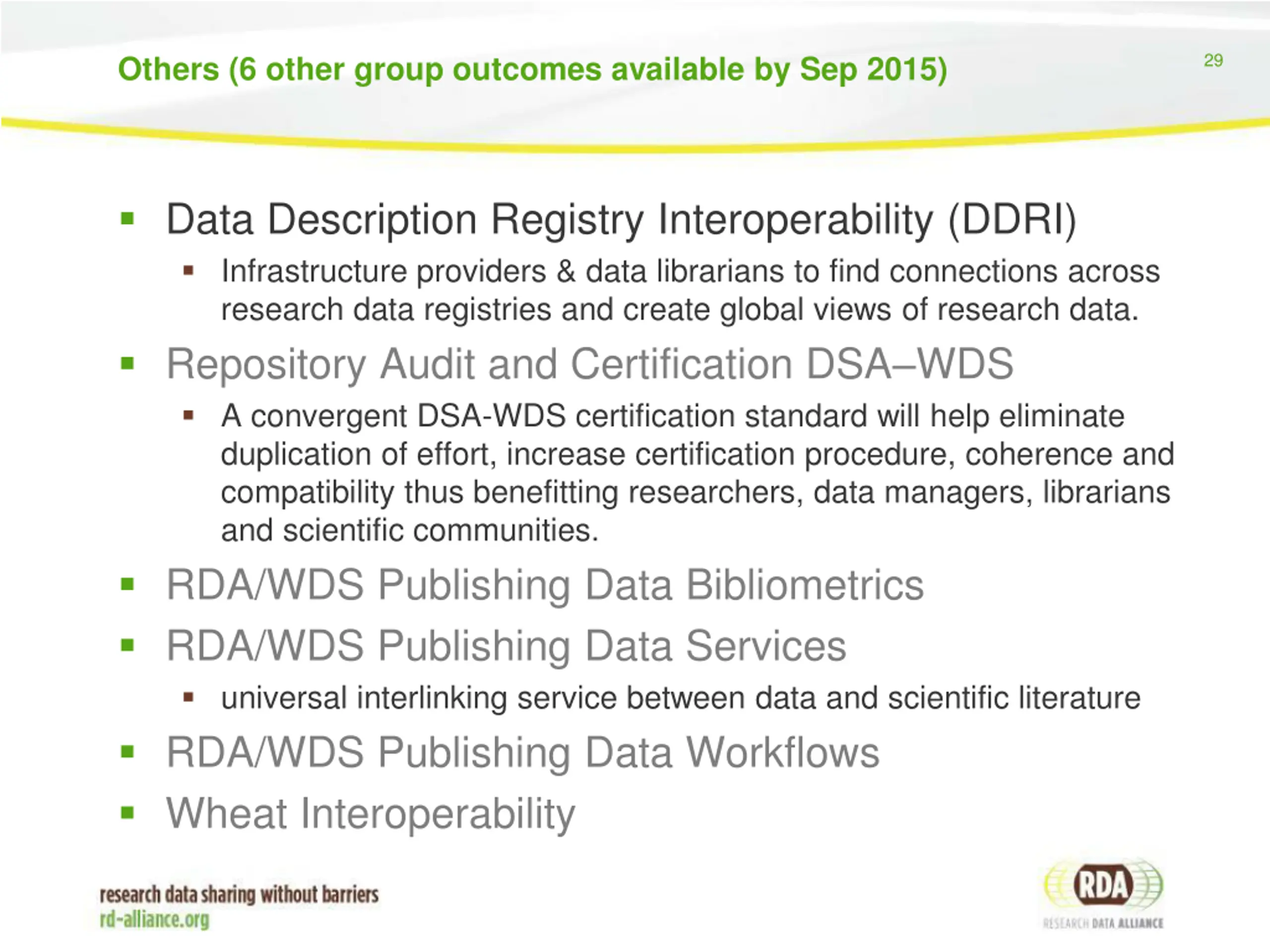 29 Others (6 other group outcomes available by Sep 2015) Data Description Registry Interoperability (DDRI) Infrastructure providers & data librarians to find connections across research data registries and create global views of research data. Repository Audit and Certification DSA WDS A convergent DSA-WDS certification standard will help eliminate duplication of effort, increase certification procedure, coherence and compatibility thus benefitting researchers, data managers, librarians and scientific communities. RDA/WDS Publishing Data Bibliometrics RDA/WDS Publishing Data Services universal interlinking service between data and scientific literature RDA/WDS Publishing Data Workflows Wheat Interoperability