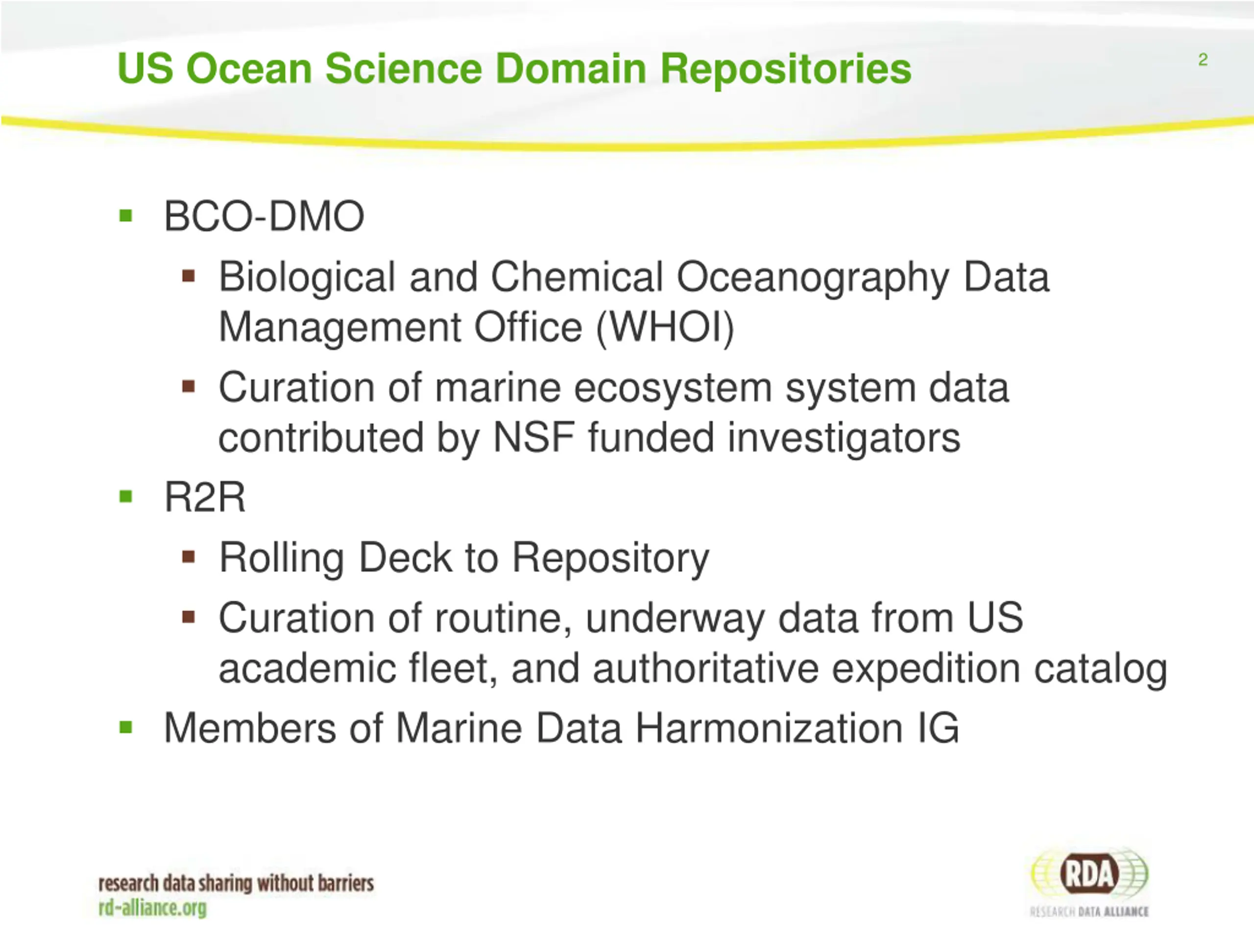 US Ocean Science Domain Repositories 2 BCO-DMO Biological and Chemical Oceanography Data Management Office (WHOI) Curation of marine ecosystem system data contributed by NSF funded investigators R2R Rolling Deck to Repository Curation of routine, underway data from US academic fleet, and authoritative expedition catalog Members of Marine Data Harmonization IG