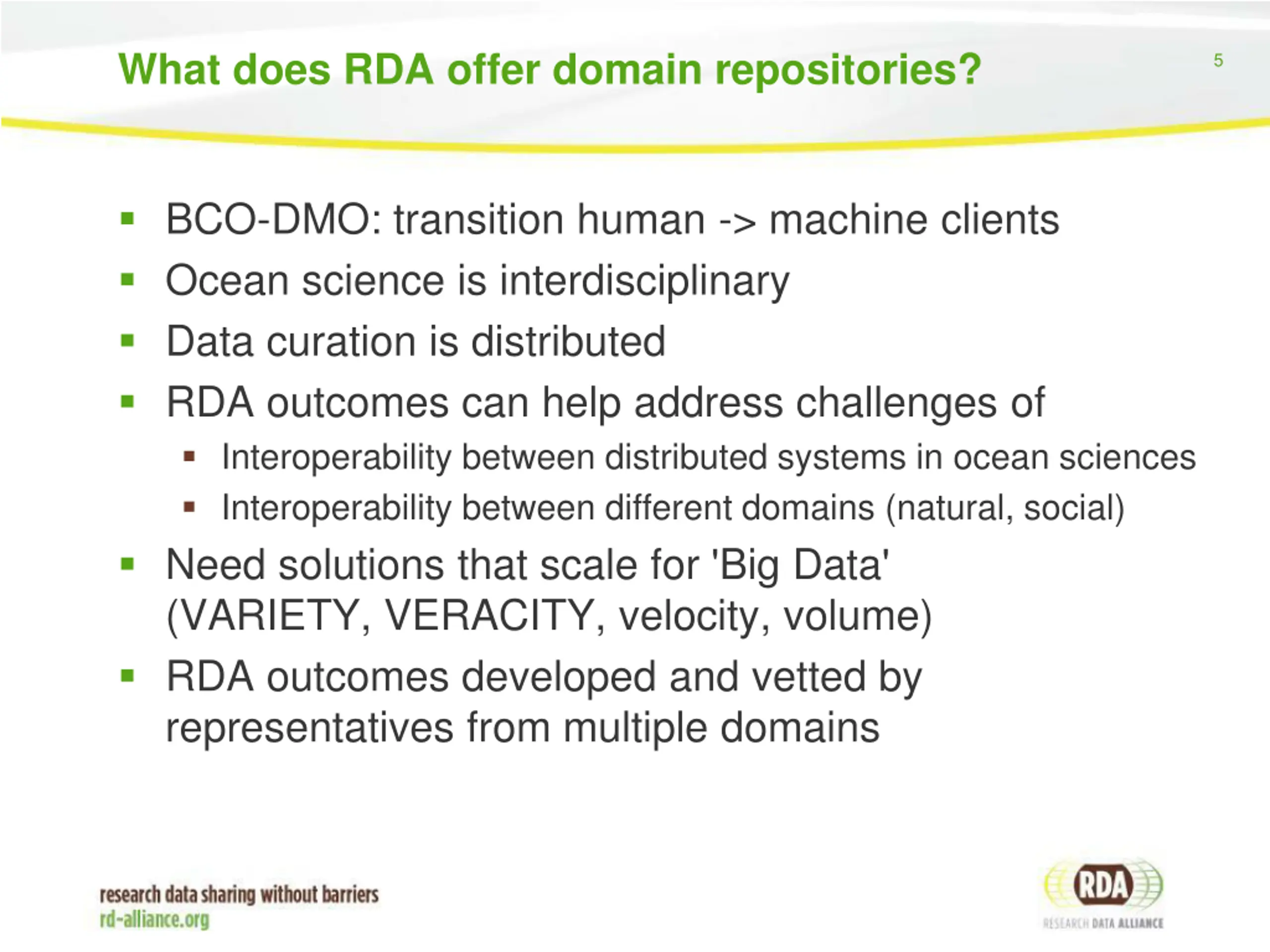 What does RDA offer domain repositories? 5 BCO-DMO: transition human -> machine clients Ocean science is interdisciplinary Data curation is distributed RDA outcomes can help address challenges of Interoperability between distributed systems in ocean sciences Interoperability between different domains (natural, social) Need solutions that scale for 'Big Data' (VARIETY, VERACITY, velocity, volume) RDA outcomes developed and vetted by representatives from multiple domains