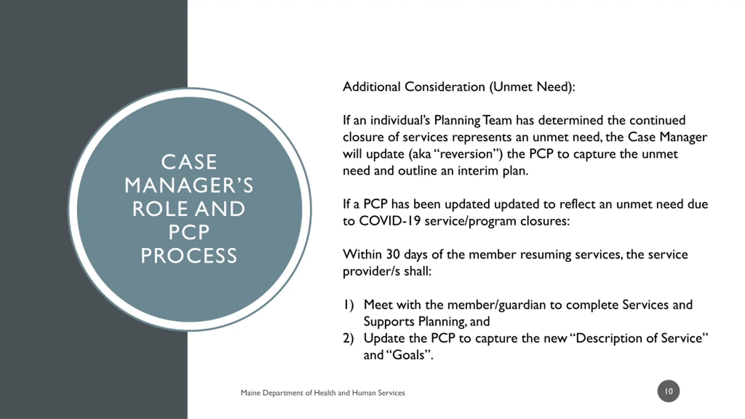 Additional Consideration (Unmet Need): If an individual s Planning Team has determined the continued closure of services represents an unmet need, the Case Manager will update (aka reversion ) the PCP to capture the unmet need and outline an interim plan. CASE MANAGER S ROLE AND PCP PROCESS If a PCP has been updated updated to reflect an unmet need due to COVID-19 service/program closures: Within 30 days of the member resuming services, the service provider/s shall: 1) Meet with the member/guardian to complete Services and Supports Planning, and 2) Update the PCP to capture the new Description of Service and Goals . 10
