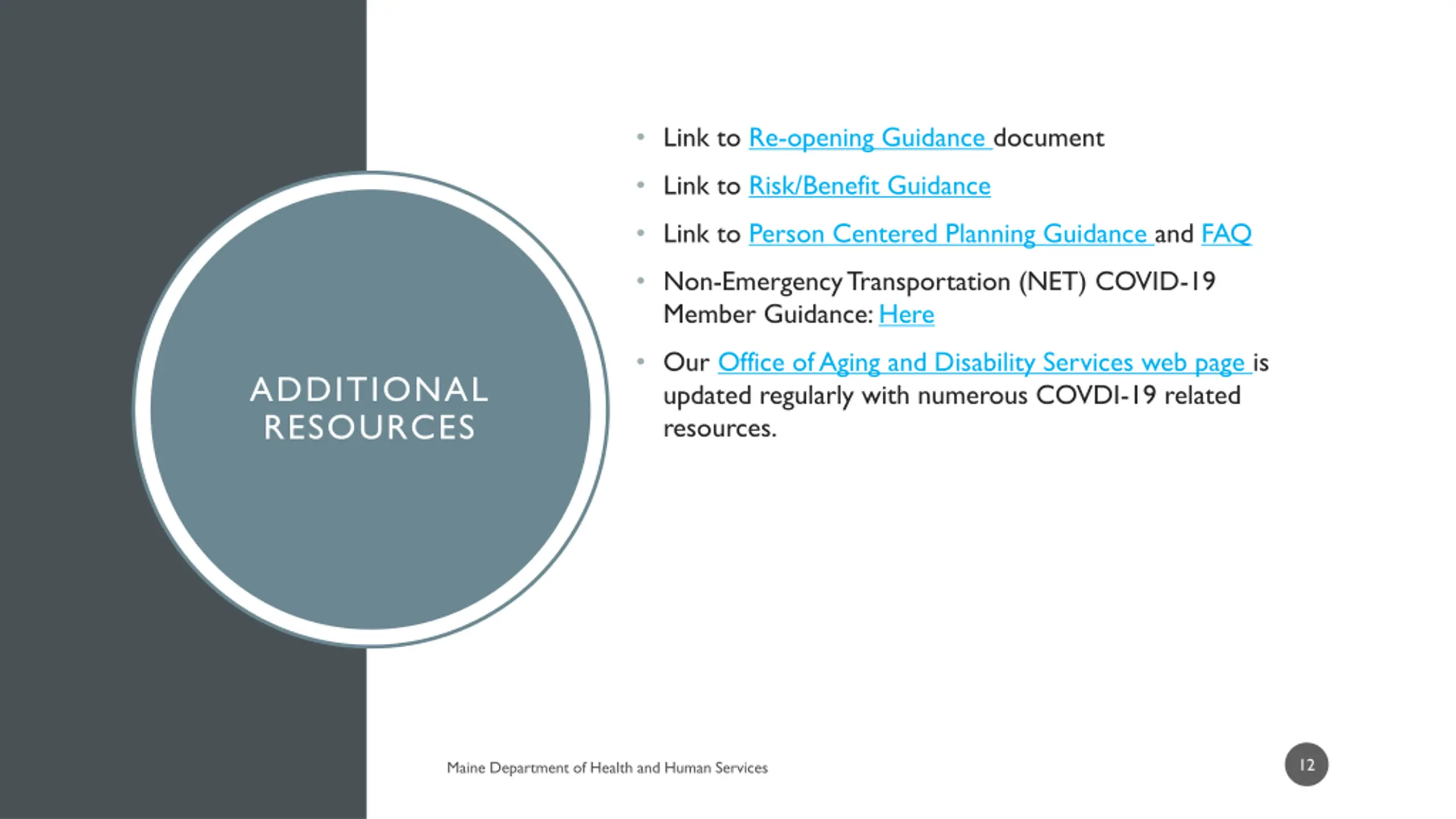 Link to Re-opening Guidance document Link to Risk/Benefit Guidance Link to Person Centered Planning Guidance and FAQ Non-Emergency Transportation (NET) COVID-19 Member Guidance: Here Our Office of Aging and Disability Services web page is updated regularly with numerous COVDI-19 related resources. ADDITIONAL RESOURCES 12