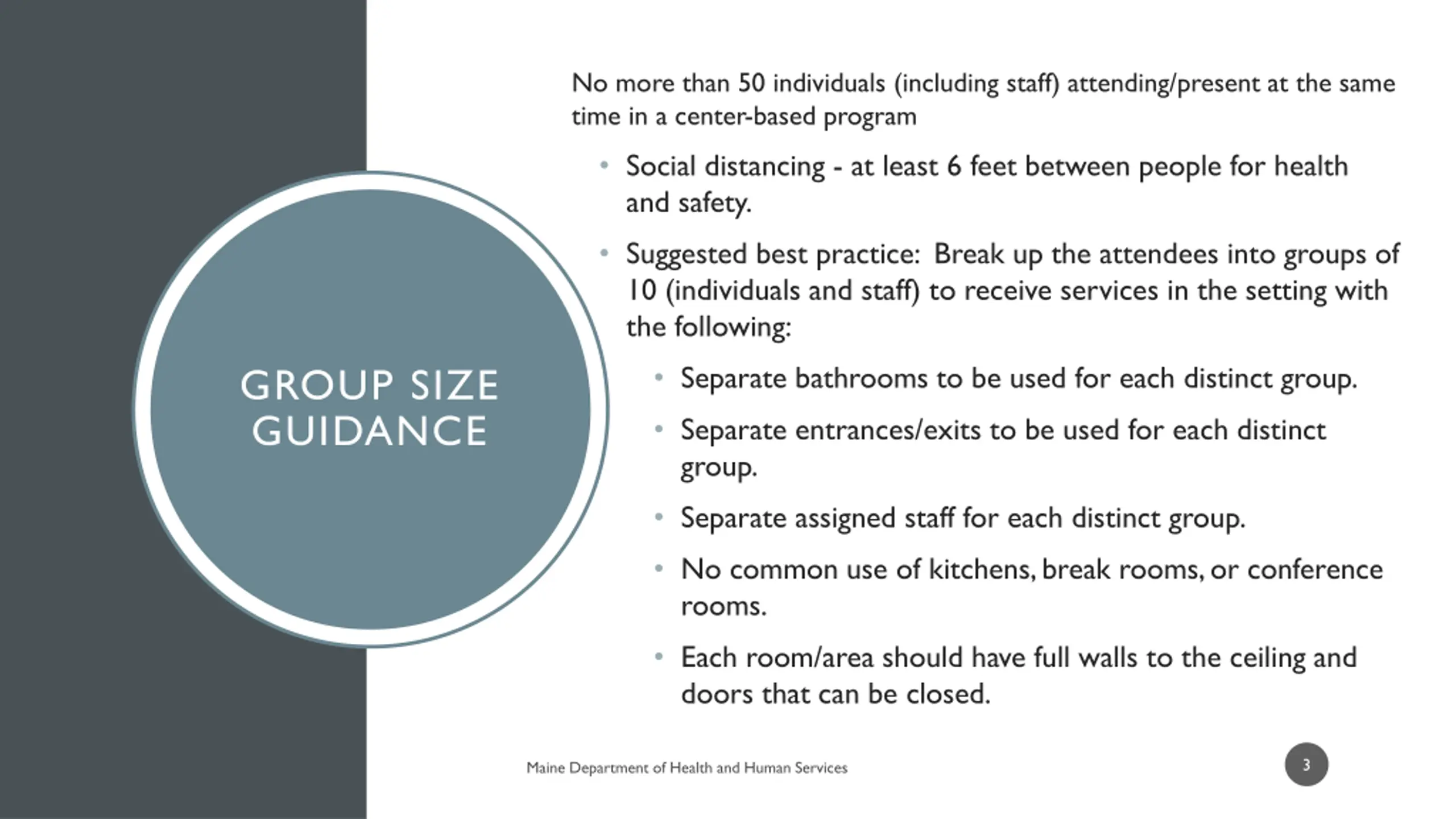 Nomore than 50 individuals (including staff) attending/present at the same time in a center-based program Social distancing - at least 6 feet between people for health and safety. Suggested best practice: Break up the attendees into groups of 10 (individuals and staff) to receive services in the setting with the following: Separate bathrooms to be used for each distinct group. GROUP SIZE GUIDANCE Separate entrances/exits to be used for each distinct group. Separate assigned staff for each distinct group. No common use of kitchens, break rooms, or conference rooms. Each room/area should have full walls to the ceiling and doors that can be closed. 3