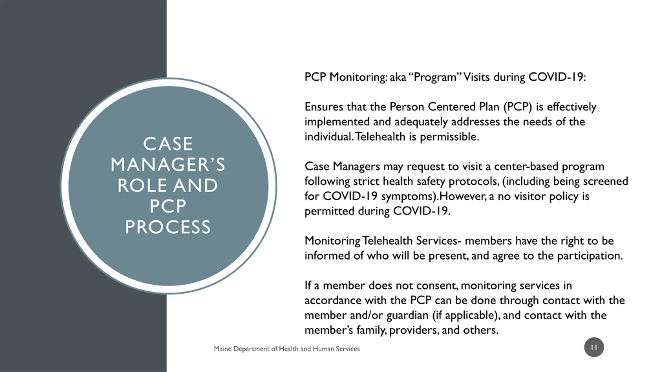 PCP Monitoring: aka Program Visits during COVID-19: Ensures that the Person Centered Plan (PCP) is effectively implemented and adequately addresses the needs of the individual. Telehealth is permissible. CASE MANAGER S ROLE AND PCP PROCESS Case Managers may request to visit a center-based program following strict health safety protocols, (including being screened for COVID-19 symptoms).However, a no visitor policy is permitted during COVID-19. Monitoring Telehealth Services- members have the right to be informed of who will be present, and agree to the participation. If a member does not consent, monitoring services in accordance with the PCP can be done through contact with the member and/or guardian (if applicable), and contact with the member s family, providers, and others. 11