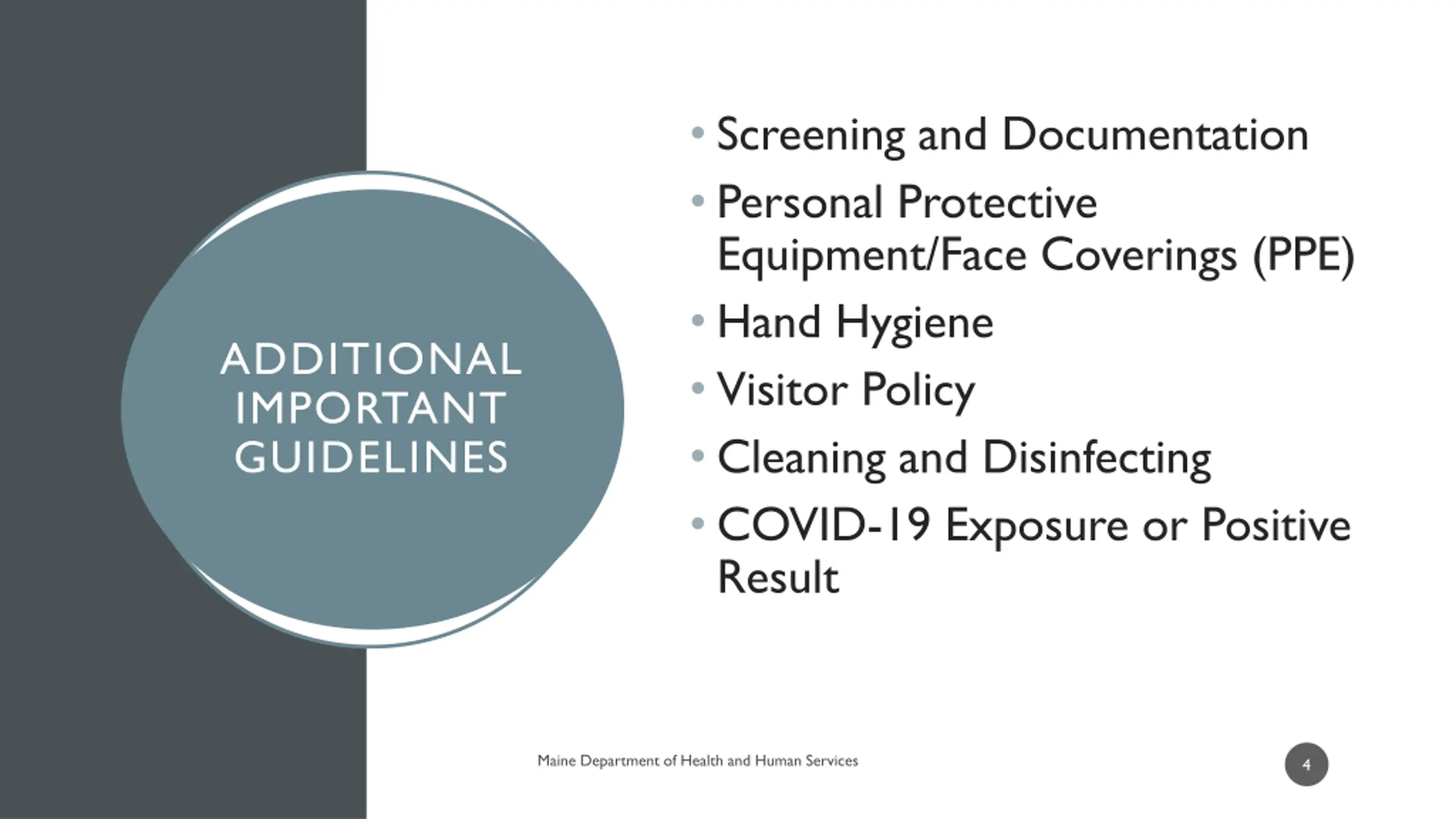 Screening and Documentation Personal Protective Equipment/Face Coverings (PPE) Hand Hygiene Visitor Policy Cleaning and Disinfecting COVID-19 Exposure or Positive Result ADDITIONAL IMPORTANT GUIDELINES 4
