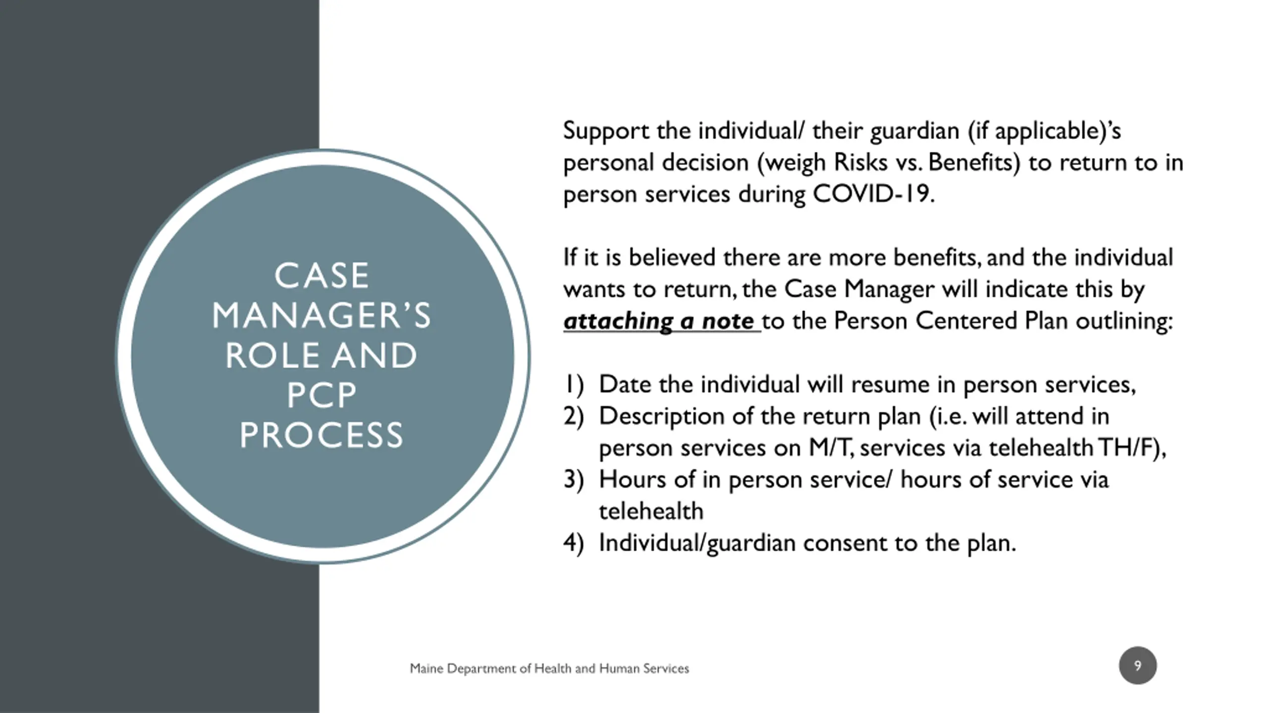 Support the individual/ their guardian (if applicable)s personal decision (weigh Risks vs. Benefits) to return to in person services during COVID-19. If it is believed there are more benefits, and the individual wants to return, the Case Manager will indicate this by attaching a note to the Person Centered Plan outlining: CASE MANAGER S ROLE AND PCP PROCESS 1) Date the individual will resume in person services, 2) Description of the return plan (i.e. will attend in person services on M/T, services via telehealth TH/F), 3) Hours of in person service/ hours of service via telehealth 4) Individual/guardian consent to the plan. 9