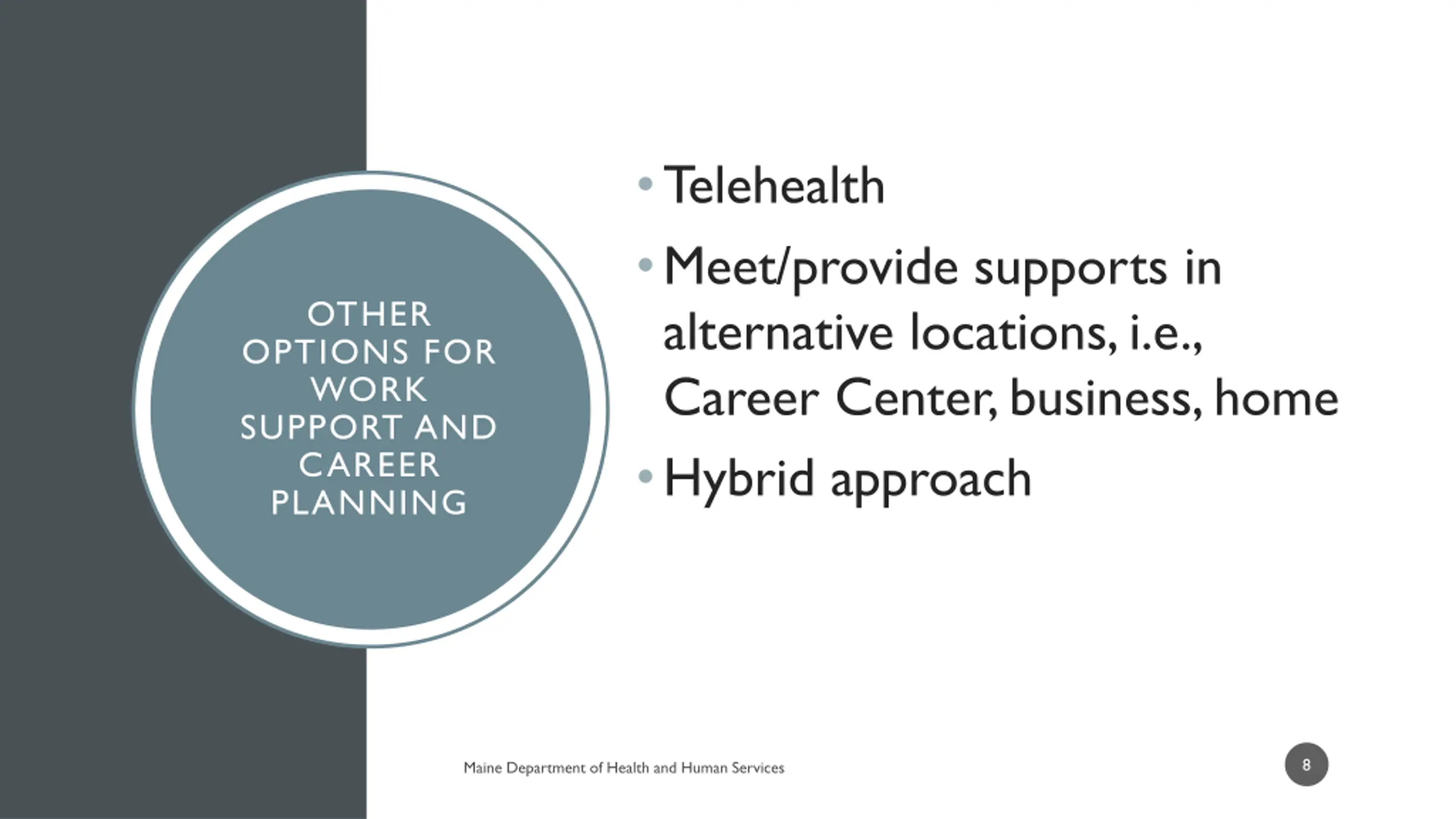 Telehealth Meet/provide supports in alternative locations, i.e., Career Center, business, home Hybrid approach OTHER OPTIONS FOR WORK SUPPORT AND CAREER PLANNING 8