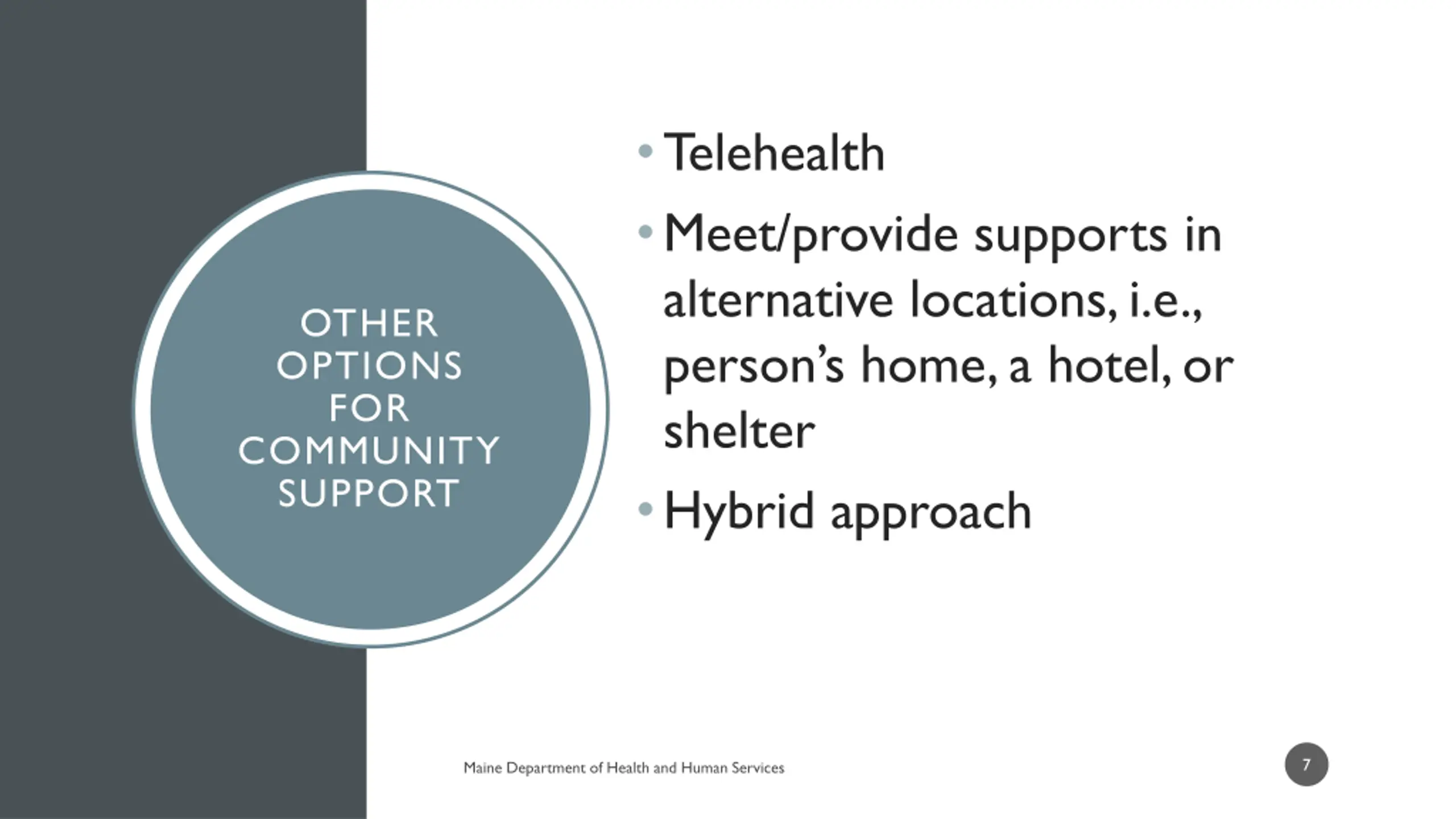 Telehealth Meet/provide supports in alternative locations, i.e., person s home, a hotel, or shelter Hybrid approach OTHER OPTIONS FOR COMMUNITY SUPPORT 7