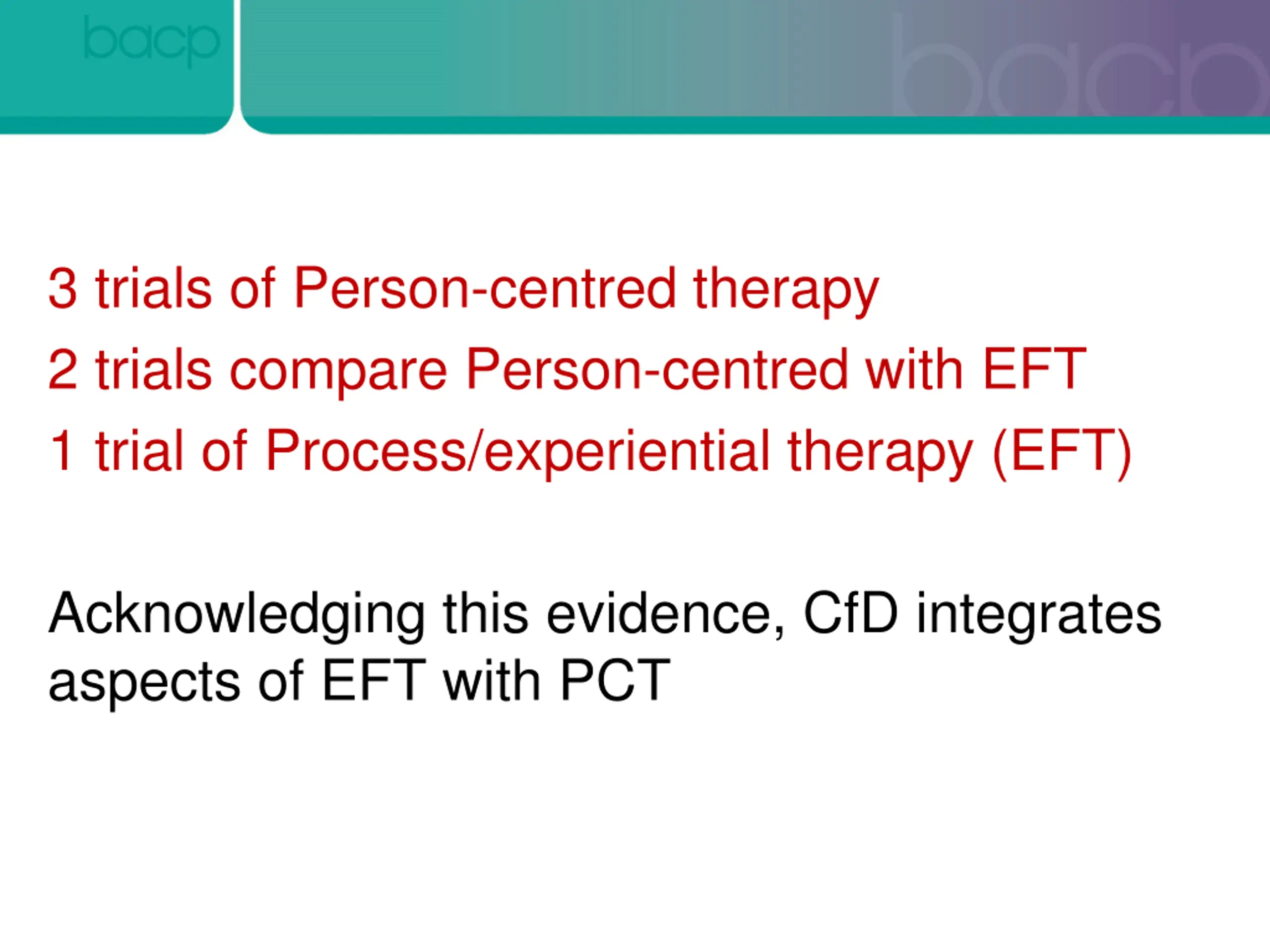 3 trials of Person-centred therapy 2 trials compare Person-centred with EFT 1 trial of Process/experiential therapy (EFT) Acknowledging this evidence, CfD integrates aspects of EFT with PCT Title of Presentation