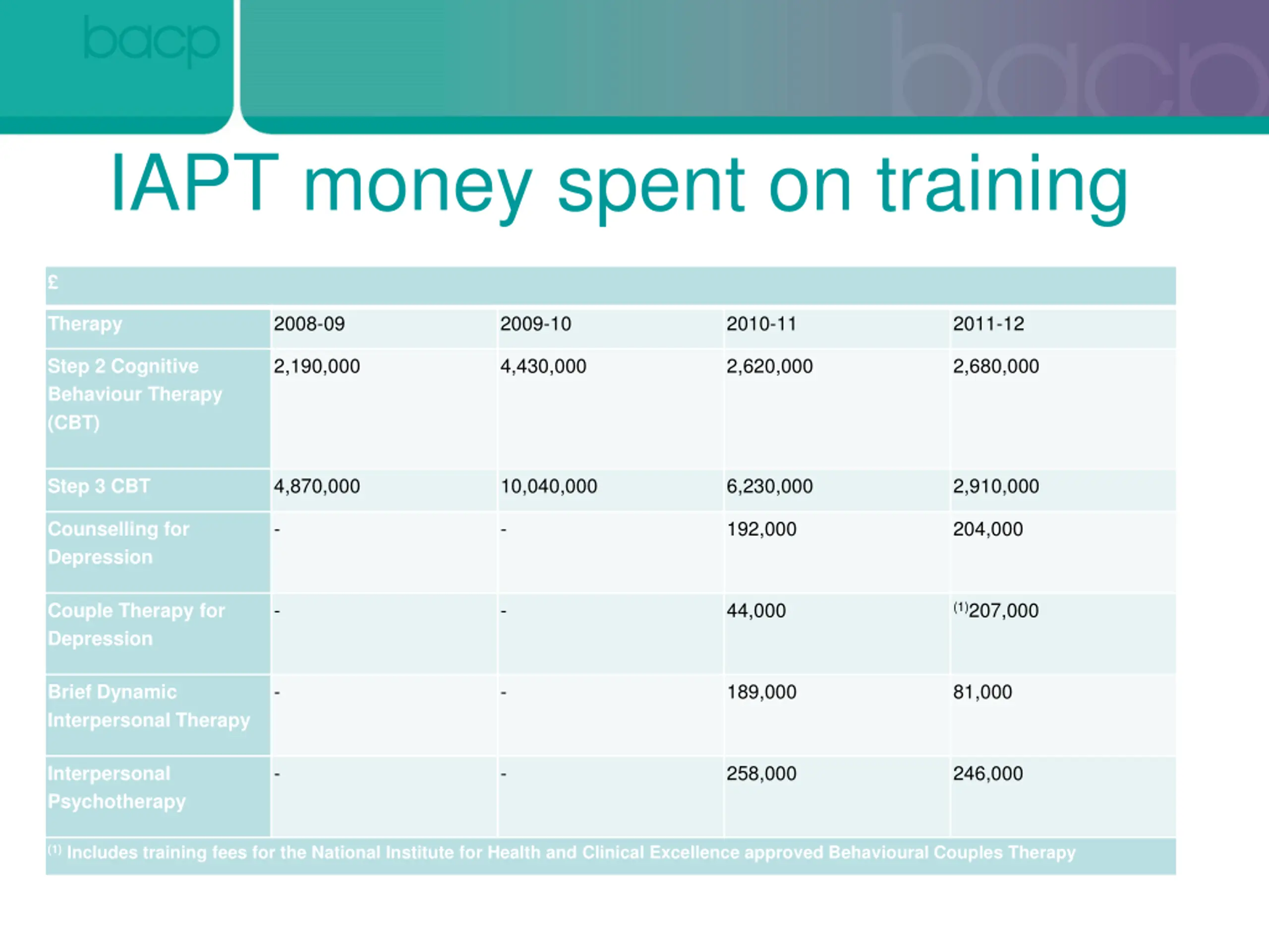 IAPT money spent on training 2008-09 2009-10 2010-11 2011-12 Therapy 2,190,000 4,430,000 2,620,000 2,680,000 Step 2 Cognitive Behaviour Therapy (CBT) 4,870,000 10,040,000 6,230,000 2,910,000 Step 3 CBT - - 192,000 204,000 Counselling for Depression - - 44,000 (1)207,000 Couple Therapy for Depression - - 189,000 81,000 Brief Dynamic Interpersonal Therapy - - 258,000 246,000 Interpersonal Psychotherapy (1)Includes training fees for the National Institute for Health and Clinical Excellence approved Behavioural Couples Therapy Title of Presentation