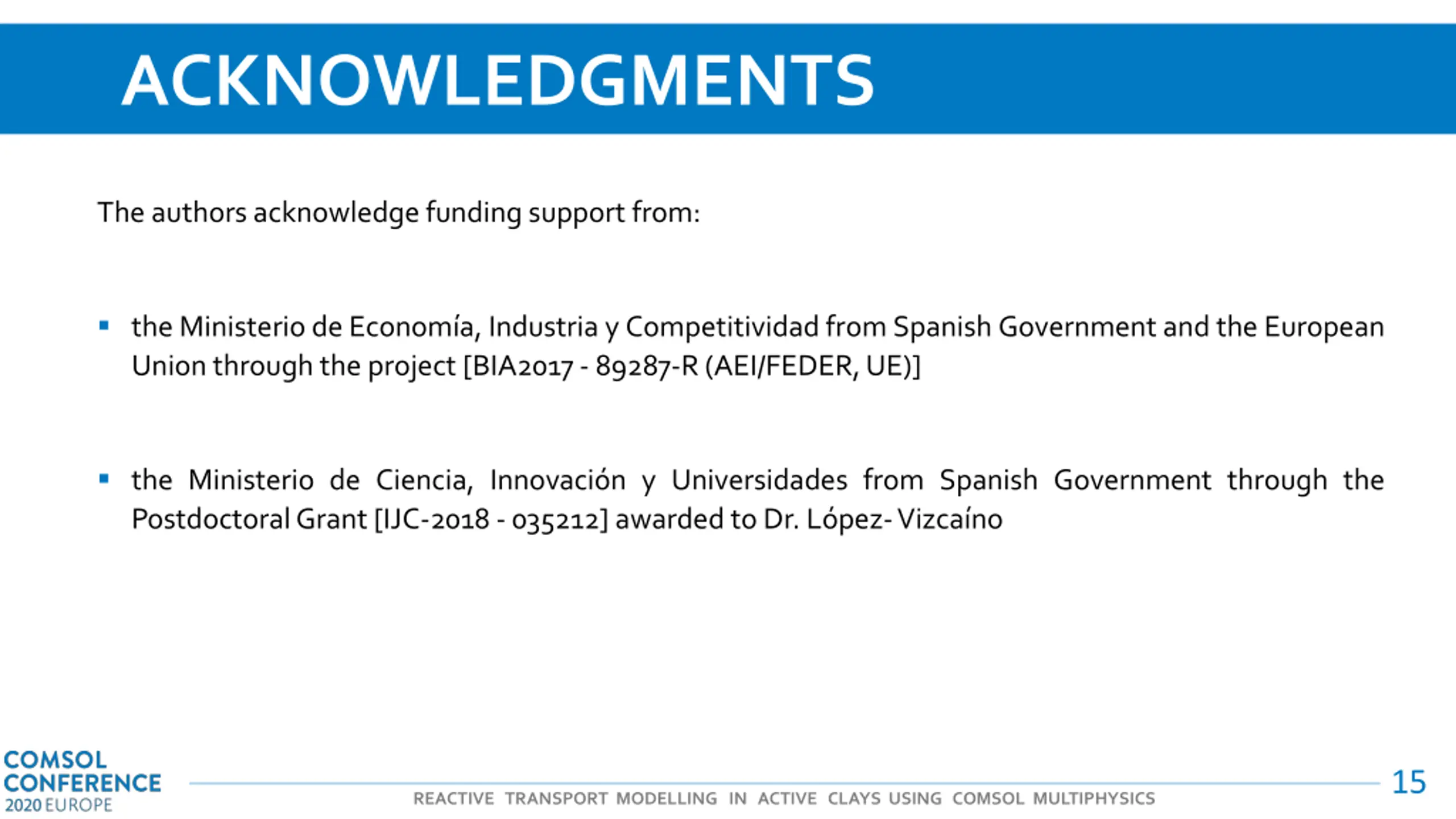 ACKNOWLEDGMENTS Theauthorsacknowledgefunding support from: theMinisteriodeEconom a,Industria yCompetitividadfromSpanishGovernmentand theEuropean Unionthroughthe project [BIA2017- 89287-R(AEI/FEDER,UE)] the Ministerio de Ciencia, Innovaci n y Universidades from Spanish Government through the PostdoctoralGrant[IJC-2018-035212]awardedtoDr.L pez-Vizca no 15 REACTIVE TRANSPORT MODELLING IN ACTIVE CLAYS USING COMSOL MULTIPHYSICS