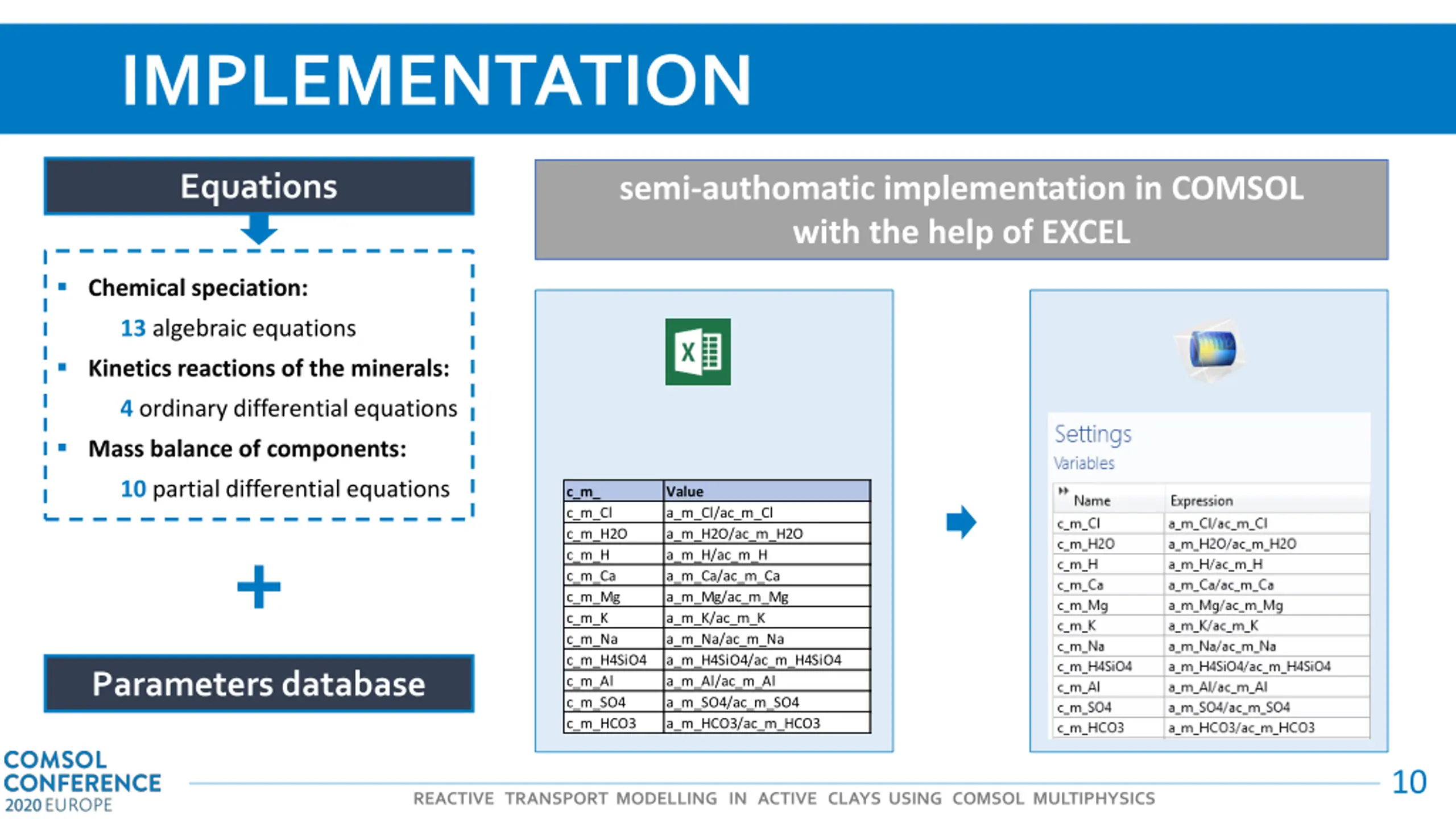 REACTIVE TRANSPORT MODEL Mass balance 10 partial differential equations Multicomponent diffusive-dispersive transport Total flux Diffusive-dispersive flux of each i-th species evaluated at L-th functional structural level = + L L L L L adv D Sr D D q e,i o,i dis = + + M m adv M m dif dis m m dif dis l l l l L e i i RT L D c Phenomenological tensor of coefficients m diffusion dispersion , , , , = = L L i L I I l (only in macro) = L i L i L L j ( ) = + + + L i L oi L i L MCD L clay ln RT a z F = Electrochemical potential M m adv M m M adv l C q i Macro , L j L j I z D c RT I ( ) = j M m dif di M i j l L j ln RT a Macro im , L i L i s D c RT ( ) = 1 j = = L i L i j ln 1 RT a z F i i 2 j L j T L j z D c F R I I = m m i j l = micro 1 j im , m dif di s = 1 i 9 REACTIVE TRANSPORT MODELLING IN ACTIVE CLAYS USING COMSOL MULTIPHYSICS