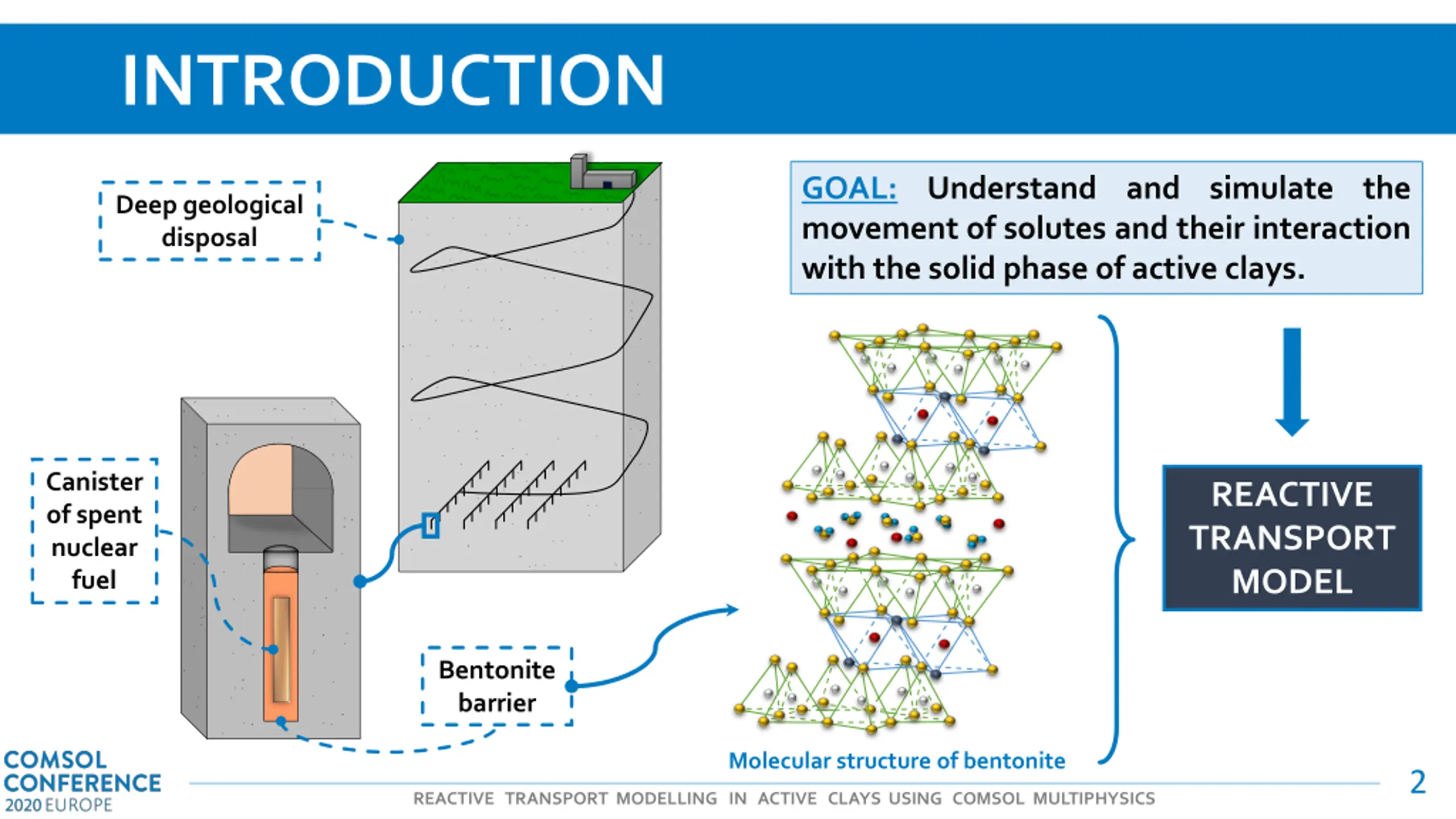 INTRODUCTION GOAL: Understand and simulate the movement of solutes and their interaction with the solid phase of active clays. Deep geological disposal Canister of spent nuclear fuel REACTIVE TRANSPORT MODEL Bentonite barrier Molecular structure of bentonite 2 REACTIVE TRANSPORT MODELLING IN ACTIVE CLAYS USING COMSOL MULTIPHYSICS