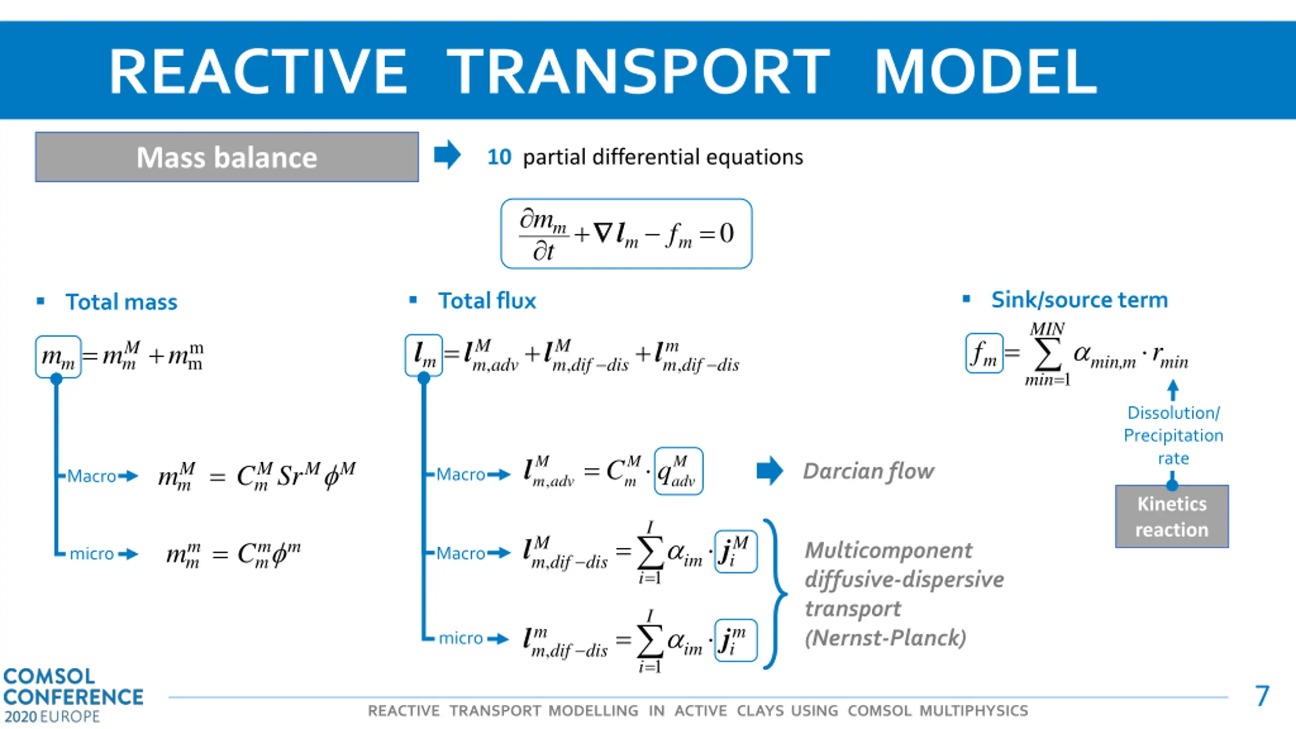 REACTIVE TRANSPORT MODEL Mass balance 10 partial differential equations m + = l 0 m t f m m Total flux = + + M m adv M m dif dis m m dif dis l l l l m , , , = M m adv M m M adv l C q Darcian flow Macro , I = M m dif di M i j l Multicomponent diffusive-dispersive transport (Nernst-Planck) Macro im , s = 1 i I = m m i j l micro im , m dif di s = 1 i 8 REACTIVE TRANSPORT MODELLING IN ACTIVE CLAYS USING COMSOL MULTIPHYSICS