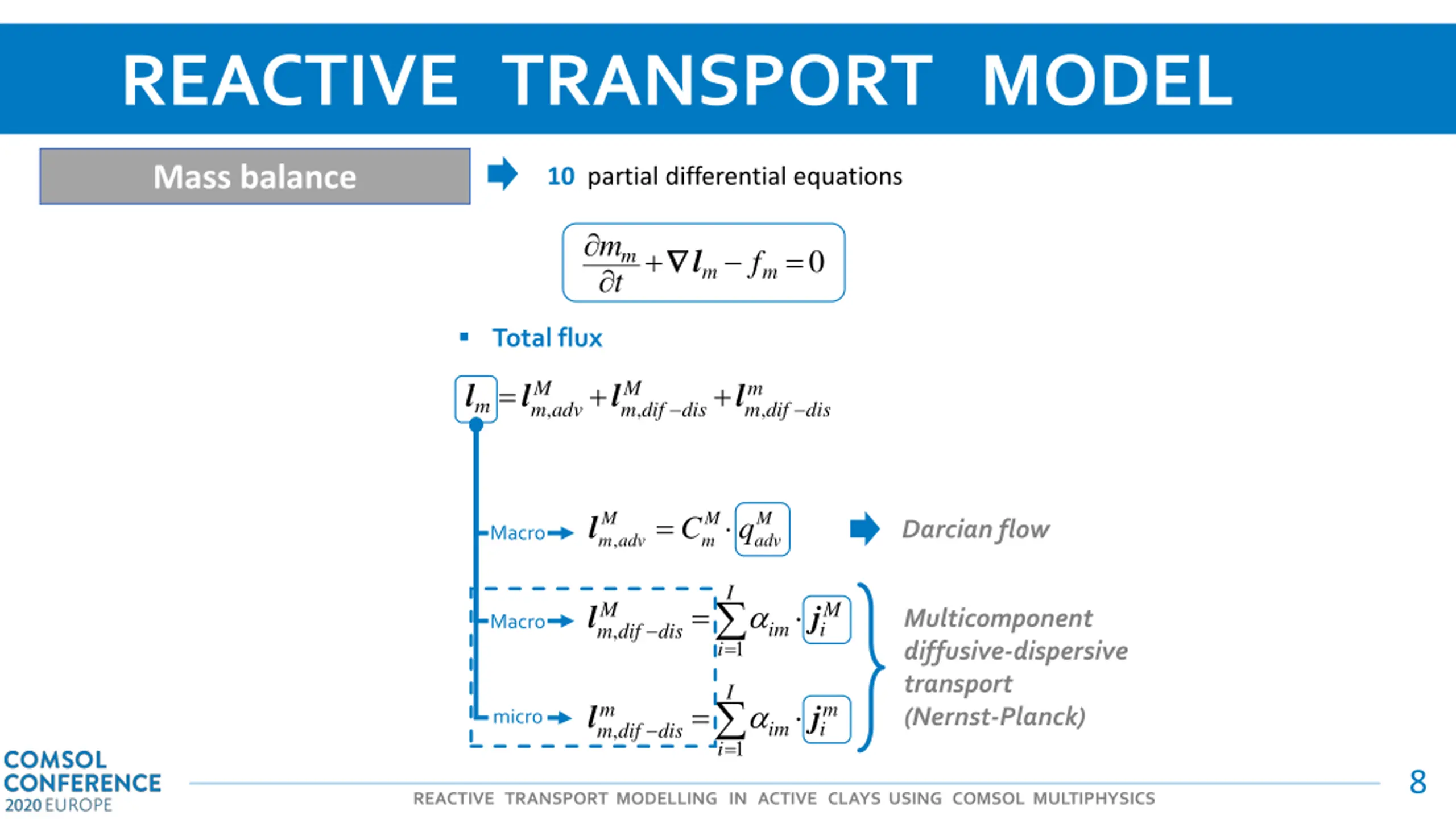 REACTIVE TRANSPORT MODEL Mass balance 10 partial differential equations m + = l 0 m t f m m Sink/source term Total flux Total mass MIN = min,m = + + M m adv M m dif dis m m dif dis f min r l l l l = + m m M m m m m m m m , , , = 1 min Dissolution/ Precipitation rate = M m adv M m M adv l C q = C Sr M m M m M M m Darcian flow Macro Macro , Kinetics reaction I = M m dif di M i j l = m m m C m m m Multicomponent diffusive-dispersive transport (Nernst-Planck) Macro micro im , s = 1 i I = m m i j l micro im , m dif di s = 1 i 7 REACTIVE TRANSPORT MODELLING IN ACTIVE CLAYS USING COMSOL MULTIPHYSICS