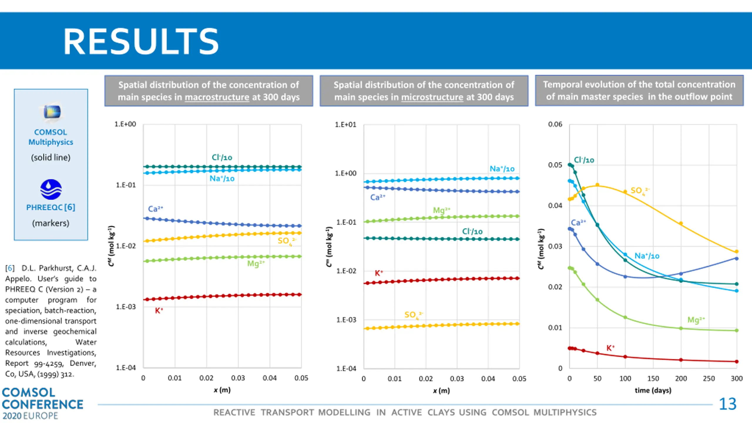 RESULTS Temporal evolution of the total concentration of main master species in the outflow point Spatial distribution of the concentration of main species in macrostructure at 300 days Spatial distribution of the concentration of main species in microstructure at 300 days 1.E+00 0.06 1.E+01 COMSOL Multiphysics Cl-/10 (solid line) Cl-/10 0.05 Na+/10 1.E+00 Na+/10 1.E-01 SO42- Ca2+ 0.04 PHREEQC[6] Ca2+ Mg2+ Ca2+ 1.E-01 (markers) CM(mol kg-1) Cm(mol kg-1) Cl-/10 CM(mol kg-1) SO42- 1.E-02 0.03 Na+/10 Mg2+ [6] D.L. Parkhurst, C.A.J. Appelo. User s guide to PHREEQ C (Version 2) a computer program speciation, batch-reaction, one-dimensional transport and inverse geochemical calculations, Resources Investigations, Report 99-4259, Denver, Co, USA,(1999) 312. 1.E-02 K+ 0.02 for 1.E-03 K+ SO42- Mg2+ 1.E-03 0.01 Water K+ 1.E-04 0 1.E-04 0 0.01 0.02 0.03 0.04 0.05 0 50 100 150 200 250 300 0 0.01 0.02 0.03 0.04 0.05 x (m) time (days) x (m) 13 REACTIVE TRANSPORT MODELLING IN ACTIVE CLAYS USING COMSOL MULTIPHYSICS