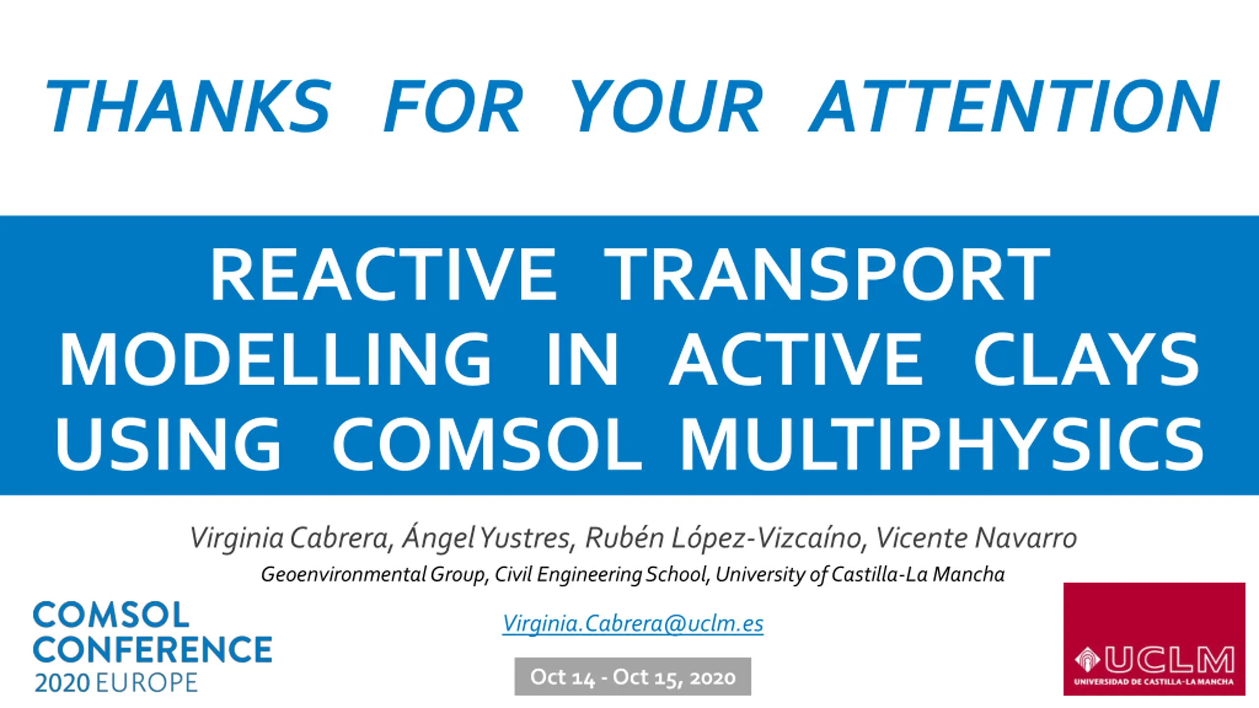 THANKS FOR YOUR ATTENTION REACTIVE TRANSPORT MODELLING IN ACTIVE CLAYS USING COMSOL MULTIPHYSICS Virginia Cabrera, ngel Yustres, Rub n L pez-Vizca no, Vicente Navarro GeoenvironmentalGroup, Civil Engineering School, University of Castilla-La Mancha Virginia.Cabrera@uclm.es Oct 14 -Oct 15, 2020