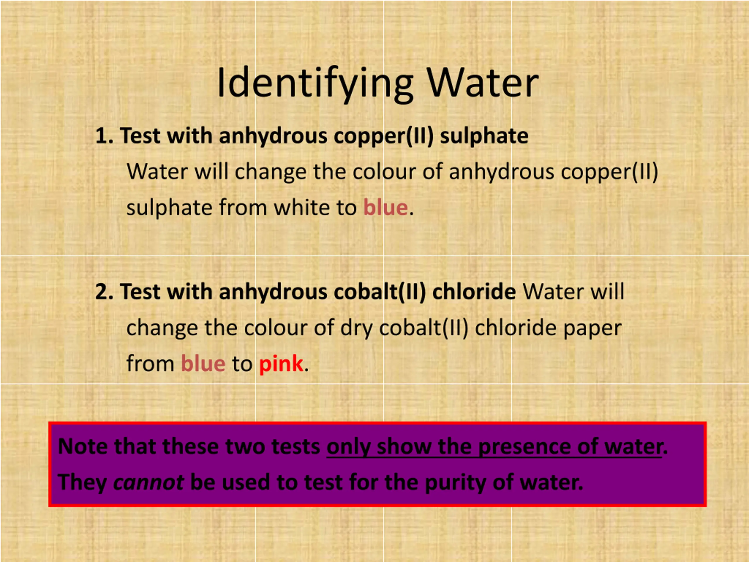 Identifying Water 1. Test with anhydrous copper(II) sulphate Water will change the colour of anhydrous copper(II) sulphate from white to blue. 2. Test with anhydrous cobalt(II) chloride Water will change the colour of dry cobalt(II) chloride paper from blue to pink. Note that these two tests only show the presence of water. They cannot be used to test for the purity of water.