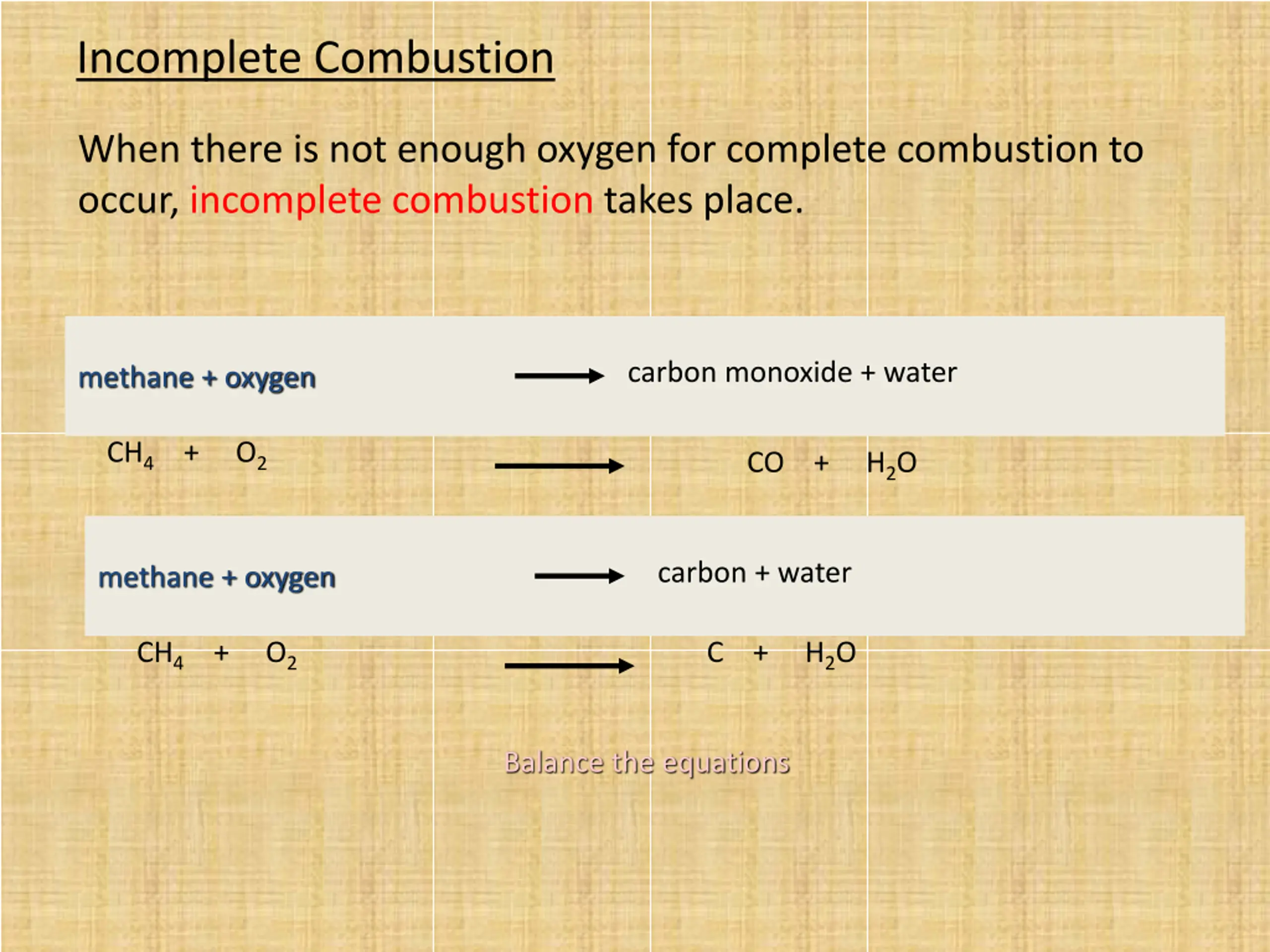 Incomplete Combustion When there is not enough oxygen for complete combustion to occur, incomplete combustion takes place. carbon monoxide + water methane + oxygen CH4 + O2 CO + H2O carbon + water methane + oxygen CH4 + O2 C + H2O Balance the equations