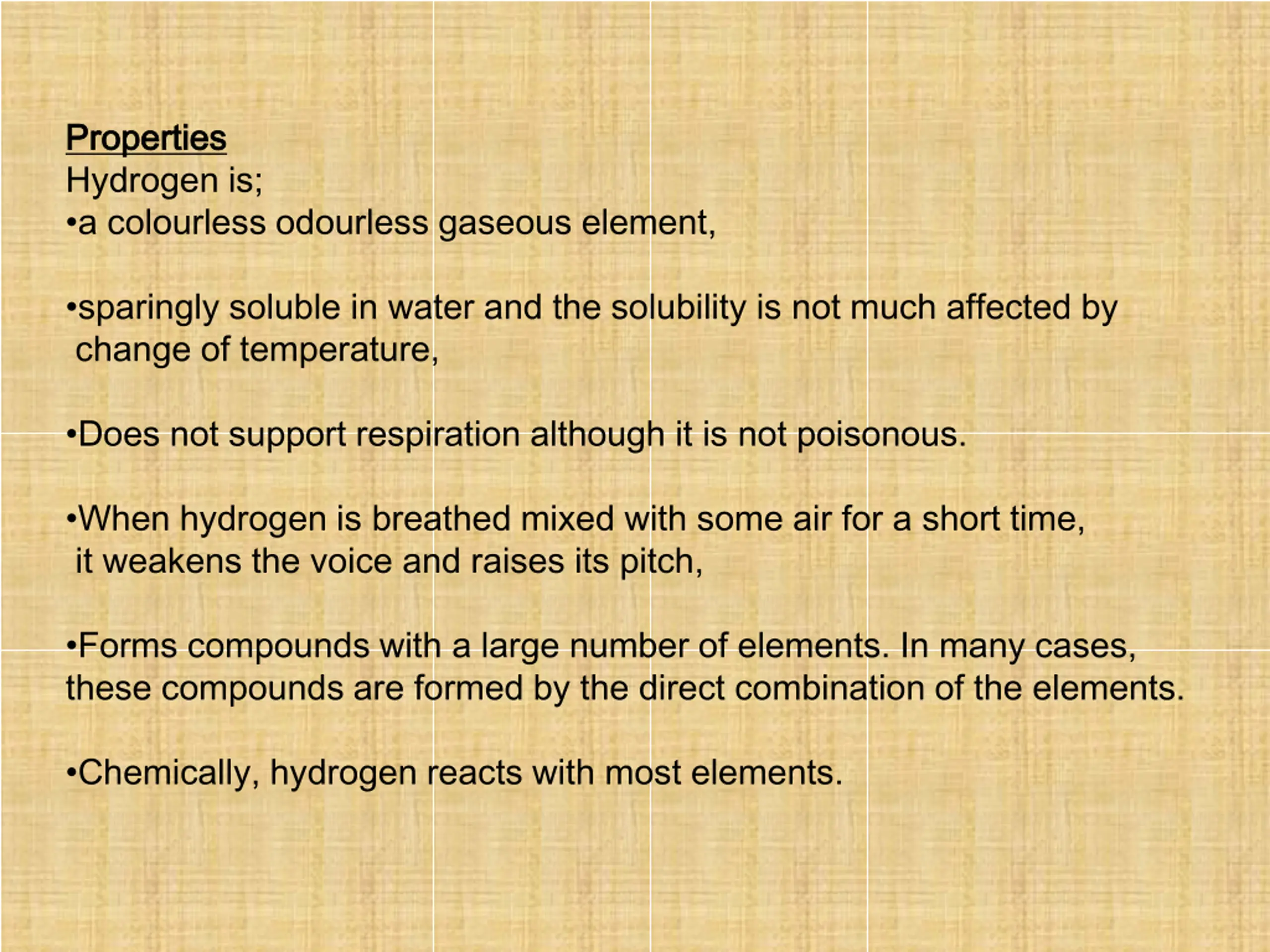 Properties Properties Hydrogen is; a colourless odourless gaseous element, sparingly soluble in water and the solubility is not much affected by change of temperature, Does not support respiration although it is not poisonous. When hydrogen is breathed mixed with some air for a short time, it weakens the voice and raises its pitch, Forms compounds with a large number of elements. In many cases, these compounds are formed by the direct combination of the elements. Chemically, hydrogen reacts with most elements.