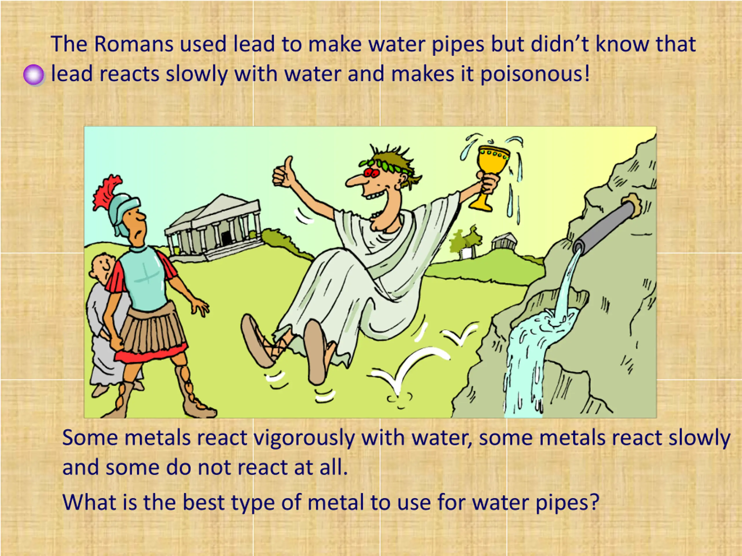The Romans used lead to make water pipes but didnt know that lead reacts slowly with water and makes it poisonous! Some metals react vigorously with water, some metals react slowly and some do not react at all. What is the best type of metal to use for water pipes?