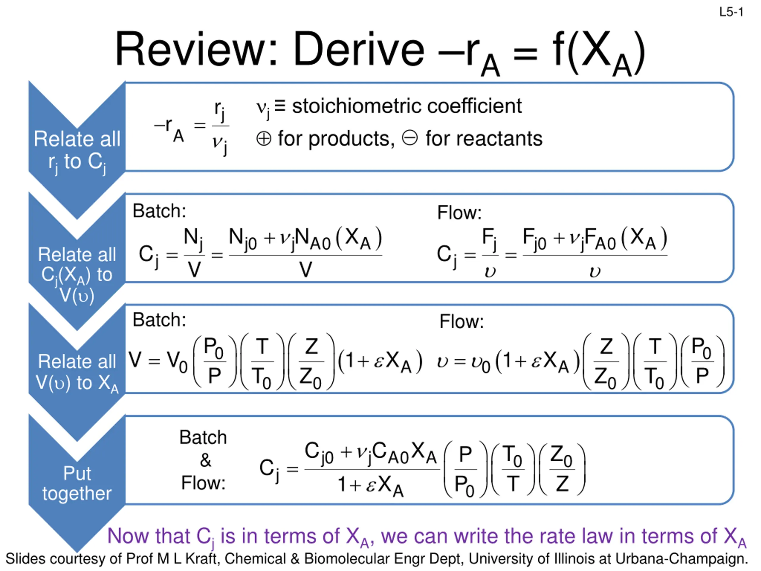 L5-1 Review: Derive rA= f(XA) j stoichiometric coefficient for products, for reactants j r j = r A Relate all rjto Cj Batch: Flow: ( ) ( ) + + j A0 F N V N j A0 N V X F F X j j0 A j j0 A = = = = C C Relate all Cj(XA) to V( ) j j Batch: Flow: P P P P T T Z Z Z Z T T ( ) ( ) 0 0 = + = + V V 1 X 1 X Relate all V( ) to XA 0 A 0 A 0 0 0 0 Batch & Flow: + + C C X T T Z Z P P j0 A0 X j A 0 0 = C Put j 1 A 0 together Now that Cj is in terms of XA, we can write the rate law in terms of XA Slides courtesy of Prof M L Kraft, Chemical & Biomolecular Engr Dept, University of Illinois at Urbana-Champaign.