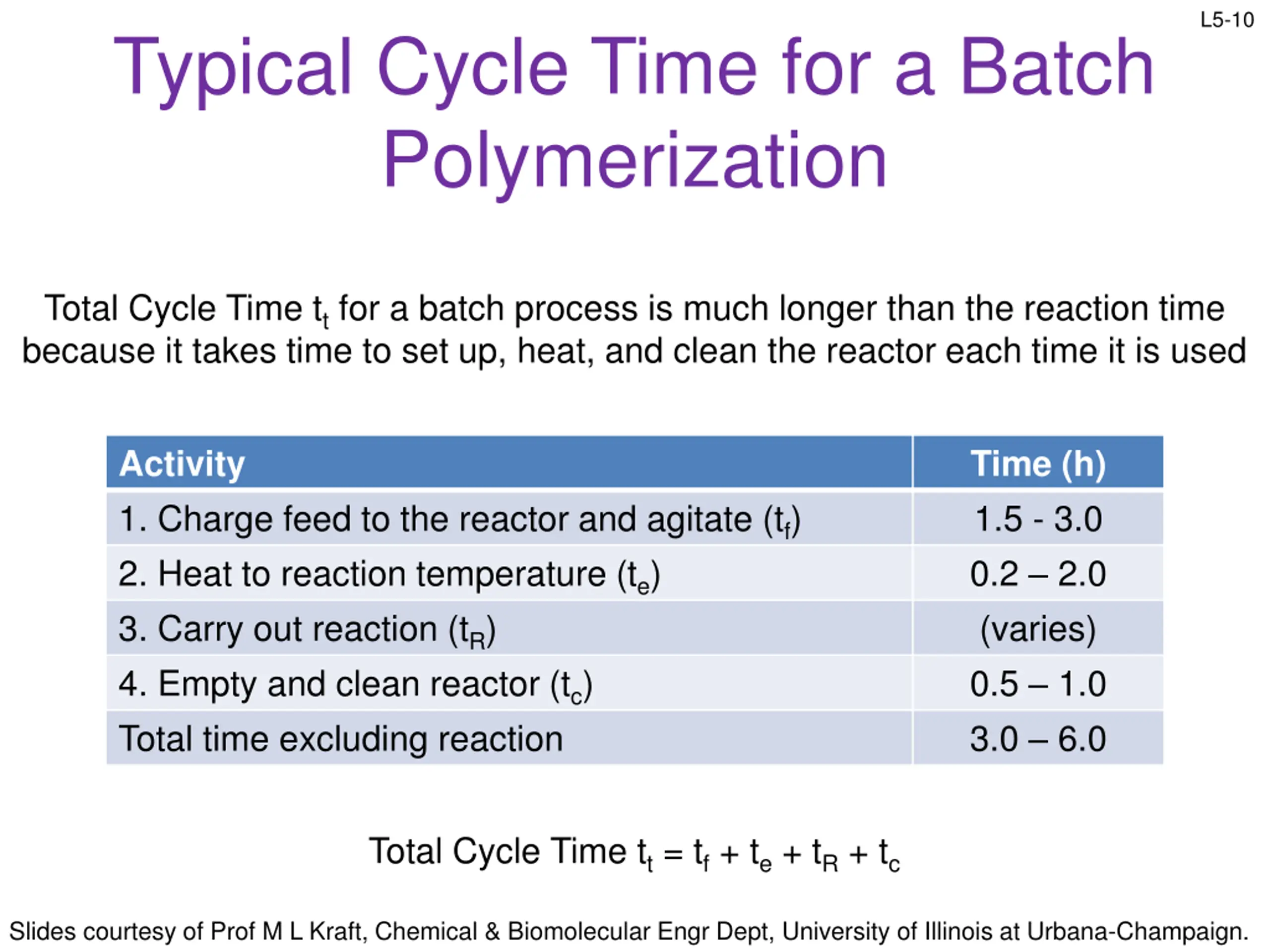 L5-10 Typical Cycle Time for a Batch Polymerization Total Cycle Time tt for a batch process is much longer than the reaction time because it takes time to set up, heat, and clean the reactor each time it is used Activity 1. Charge feed to the reactor and agitate (tf) 2. Heat to reaction temperature (te) 3. Carry out reaction (tR) 4. Empty and clean reactor (tc) Total time excluding reaction Time (h) 1.5 - 3.0 0.2 2.0 (varies) 0.5 1.0 3.0 6.0 Total Cycle Time tt = tf + te + tR + tc Slides courtesy of Prof M L Kraft, Chemical & Biomolecular Engr Dept, University of Illinois at Urbana-Champaign.
