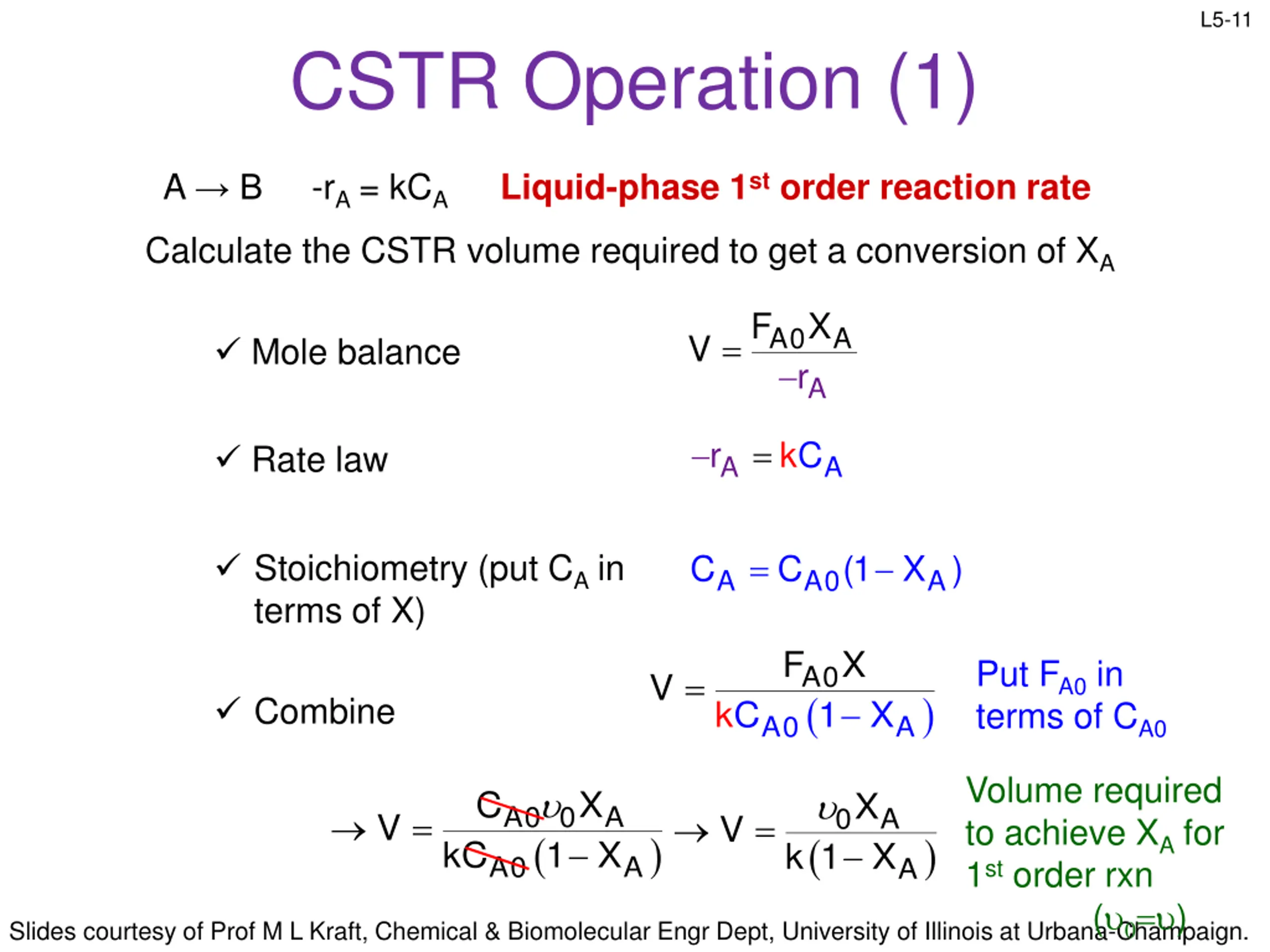 L5-11 CSTR Operation (1) A B -rA = kCA Liquid-phase 1st order reaction rate Calculate the CSTR volume required to get a conversion of XA F X A0 r A = V Mole balance A = r k C Rate law A A = (1 X ) Stoichiometry (put CA in terms of X) C C A A0 A F X Put FA0 in terms of CA0 A0 1 X = V ( ) Combine k C A0 A Volume required to achieve XA for 1st order rxn ( = ) A0 0 C X X A 0 A = = V V ( ) ( ) kC 1 X k 1 X A0 A A Slides courtesy of Prof M L Kraft, Chemical & Biomolecular Engr Dept, University of Illinois at Urbana-Champaign.