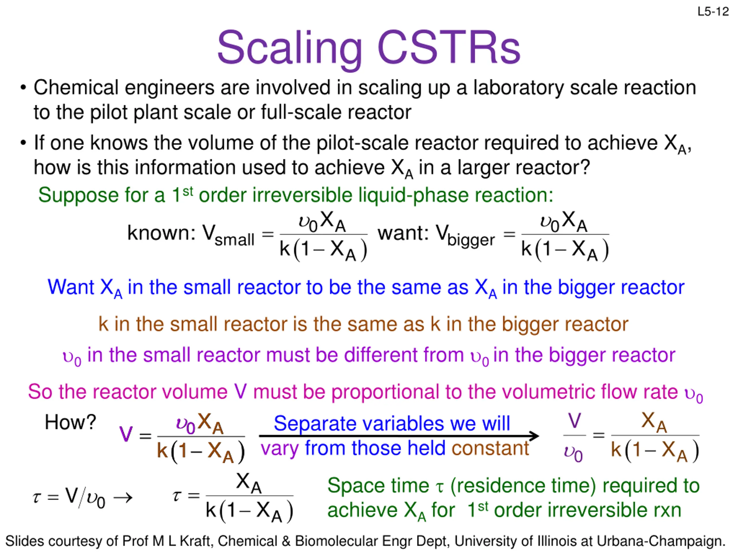 L5-12 Scaling CSTRs Chemical engineers are involved in scaling up a laboratory scale reaction to the pilot plant scale or full-scale reactor If one knows the volume of the pilot-scale reactor required to achieve XA, how is this information used to achieve XA in a larger reactor? Suppose for a 1st order irreversible liquid-phase reaction: X X 0 A 0 A = = known: V want: V small bigger ( ) ( ) k 1 X k 1 X A A Want XA in the small reactor to be the same as XA in the bigger reactor k in the small reactor is the same as k in the bigger reactor 0 in the small reactor must be different from 0 in the bigger reactor So the reactor volume V must be proportional to the volumetric flow rate 0 How? X V X X Separate variables we will vary from those held constant A 0 A A 0 = = = V V ( ) ( ( ) ) X k 1 X k 1 X k 1 X 0 A A A Space time (residence time) required to achieve XA for 1st order irreversible rxn A = = V ( ) 0 k 1 X A Slides courtesy of Prof M L Kraft, Chemical & Biomolecular Engr Dept, University of Illinois at Urbana-Champaign.