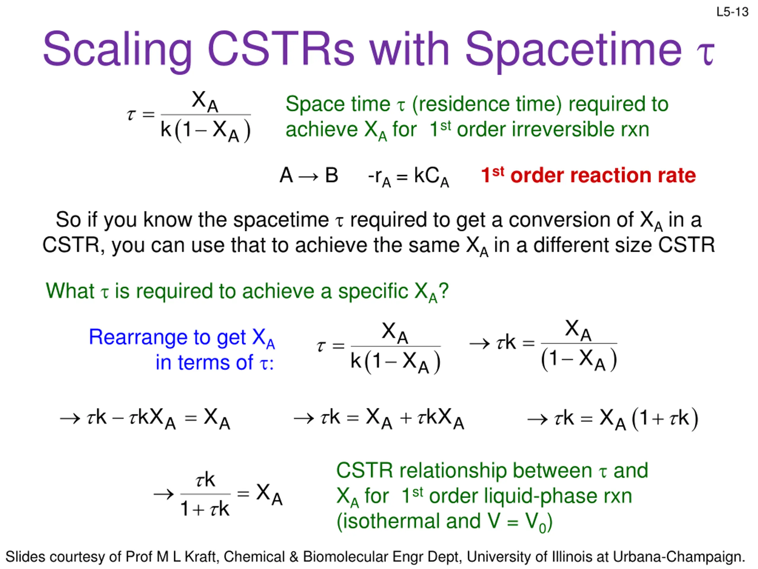 L5-13 Scaling CSTRs with Spacetime X Space time (residence time) required to achieve XA for 1st order irreversible rxn A = ( ) k 1 X A A B -rA = kCA 1st order reaction rate So if you know the spacetime required to get a conversion of XA in a CSTR, you can use that to achieve the same XA in a different size CSTR What is required to achieve a specific XA? X X Rearrange to get XA in terms of A = A k = ( ) ( ) 1 X k 1 X A A ( ) = + = = + k X kX k kX X k X 1 k A A A A A CSTR relationship between and XA for 1st order liquid-phase rxn (isothermal and V = V0) + k = X A 1 k Slides courtesy of Prof M L Kraft, Chemical & Biomolecular Engr Dept, University of Illinois at Urbana-Champaign.