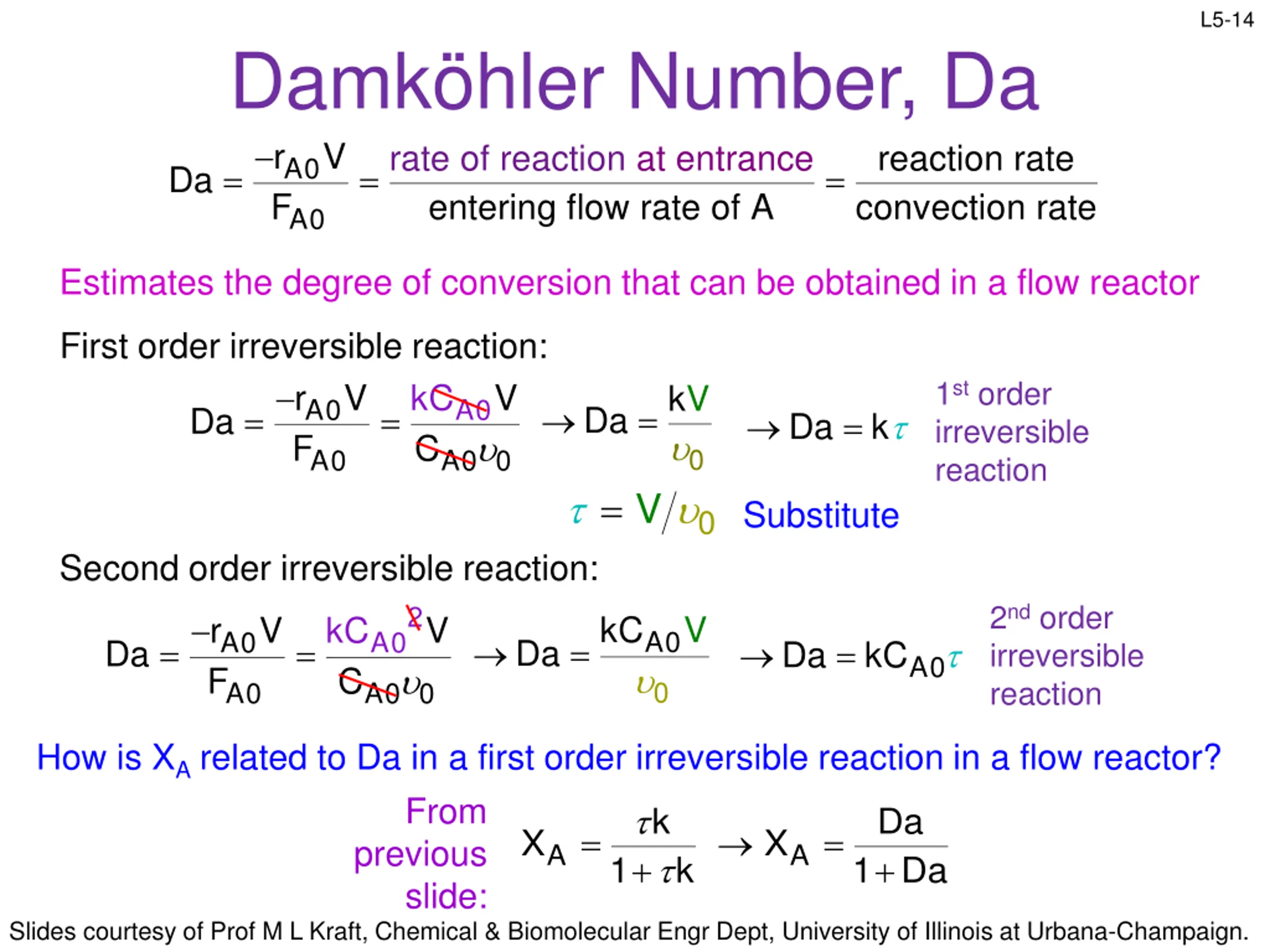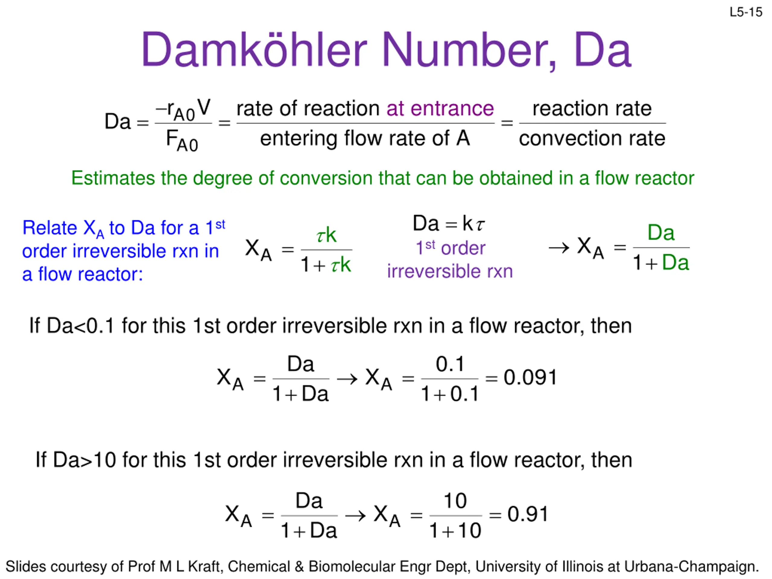 L5-15 Damk hler Number, Da A0 r F V rate of reaction enterin at en trance reaction rate convection rat = = = Da g flow rate of A e A0 Estimates the degree of conversion that can be obtained in a flow reactor = k Da 1st order irreversible rxn Relate XA to Da for a 1st order irreversible rxn in a flow reactor: Da k = X = X A A + 1 Da + 1 k If Da<0.1 for this 1st order irreversible rxn in a flow reactor, then Da 0.1 = = = X X 0.091 A A + + 1 Da 1 0.1 If Da>10 for this 1st order irreversible rxn in a flow reactor, then Da 10 = = = X X 0.91 A A + + 1 Da 1 10 Slides courtesy of Prof M L Kraft, Chemical & Biomolecular Engr Dept, University of Illinois at Urbana-Champaign.