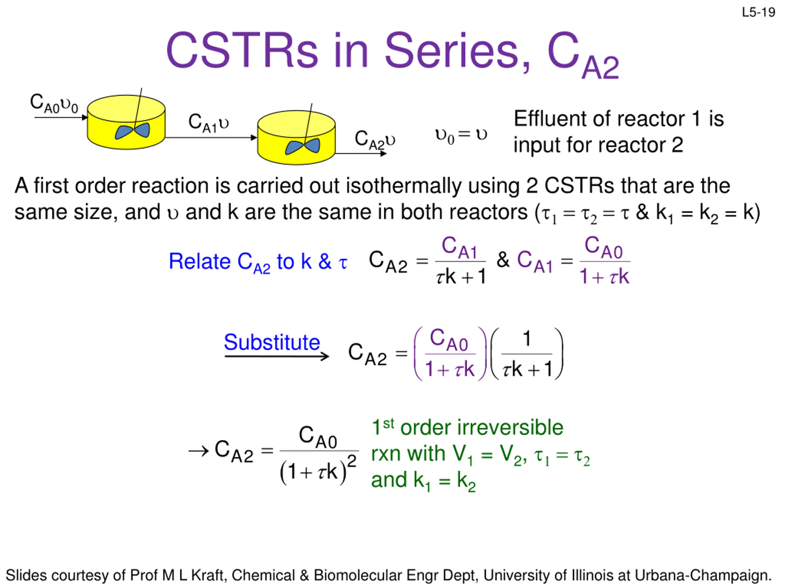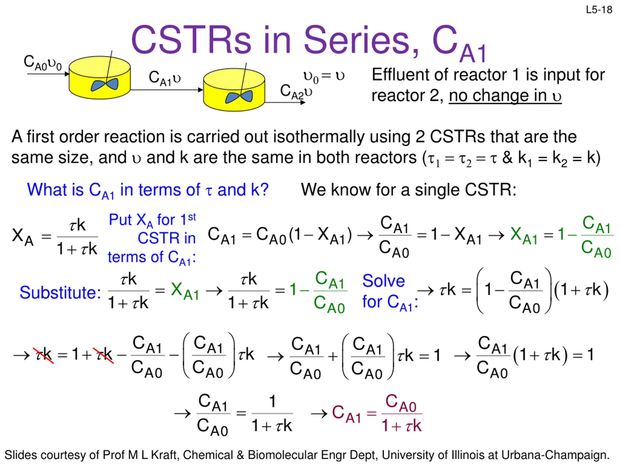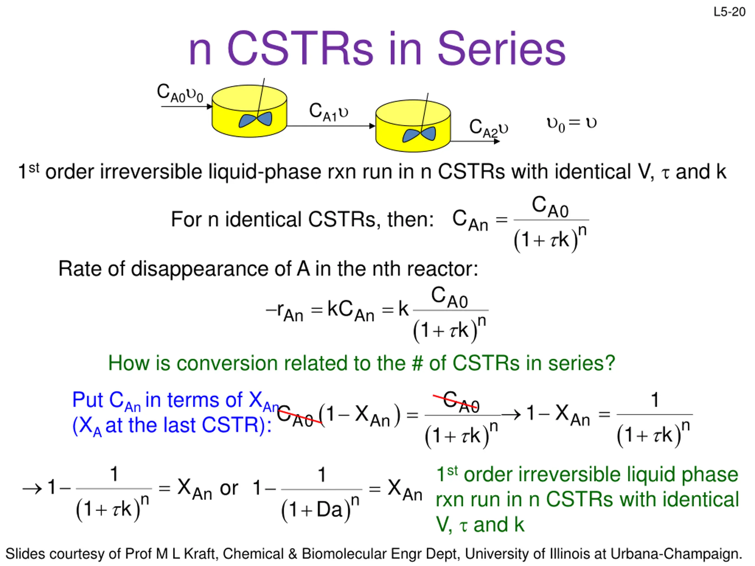 L5-20 n CSTRs in Series CA0 0 CA1 = CA2 1st order irreversible liquid-phase rxn run in n CSTRs with identical V, and k C + A0 = C For n identical CSTRs, then: An n ( ) 1 k Rate of disappearance of A in the nth reactor: C + A0 An r = = kC k An n ( ) 1 k How is conversion related to the # of CSTRs in series? C Put CAn in terms of XAn (XA at the last CSTR): 1 ( ) A0 1 X = = C 1 X An A0 An n n ( ) ( ) + + 1 k 1 k 1 1st order irreversible liquid phase rxn run in n CSTRs with identical V, and k 1 1 = = X or 1 X An An n n ( ) ( ) + + 1 k 1 Da Slides courtesy of Prof M L Kraft, Chemical & Biomolecular Engr Dept, University of Illinois at Urbana-Champaign.